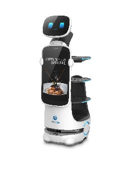 ファミリーレストランなどのカジュアルな食事シーンに特化したロボットで、混雑時の配送・配膳・下げ膳のサポートを行います。マルチモーダルインタラクション(視覚·聴覚を含めた複数のコミュニケーション方法)機能が搭載されており、ライト・音声・テキストを組み合わせてお客様に適切な情報を伝えることが可能なため、スタッフが介入せずに配送・配膳・下げ膳を行うことができます。