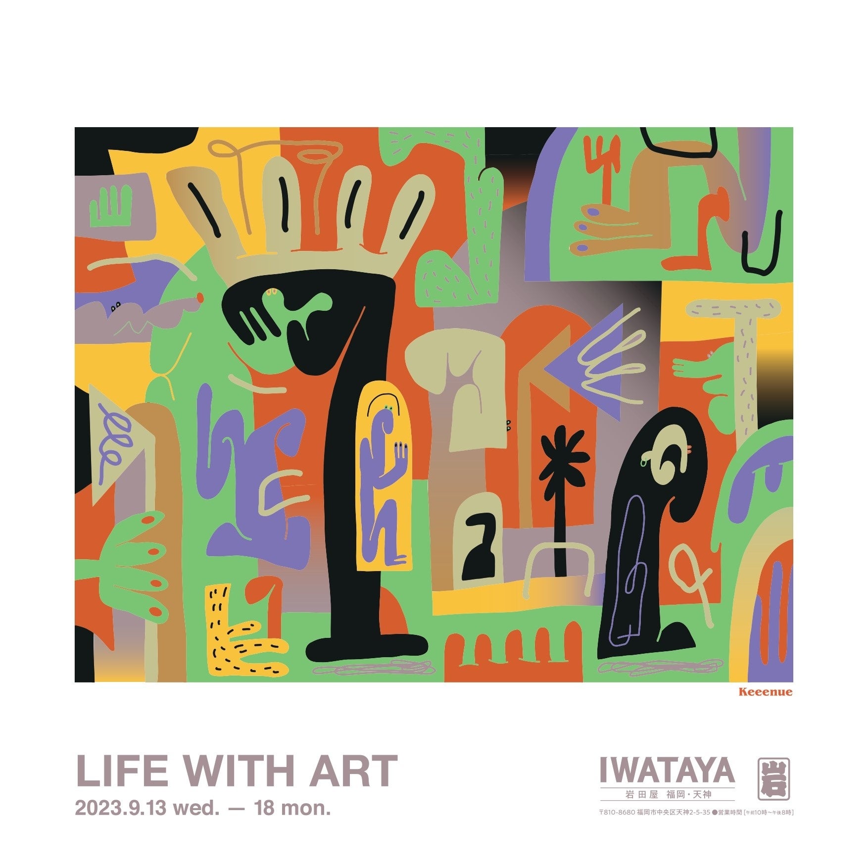 入場無料にて作品を展示・販売いたします。本展のビジュアルは、アーティスト・Keeenueが手がけており、ウィンドウやエントランス・通路・エレベーターなど随所にあしらわれ、岩田屋本店を彩ります。