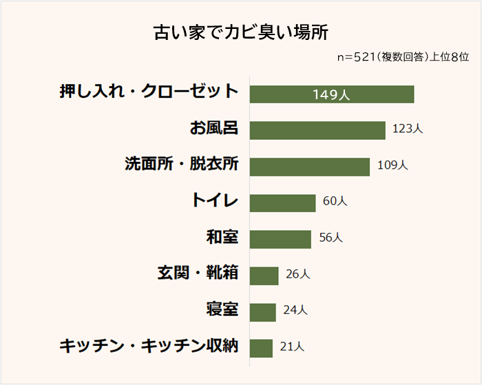 続いて、古い家でカビの臭いが気になる部屋や場所を聞いたところ、最も多かった回答は「押し入れ・クローゼット(149人)」でした。