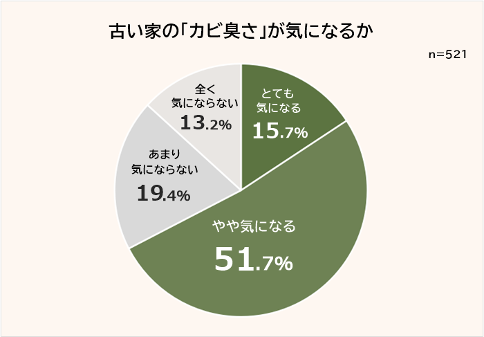 古い家にお住まいの521名に「古い家のカビ臭さが気になるか」を聞いたところ、「とても気になる」「やや気になる」と答えた人が合わせて7割近くにのぼりました。