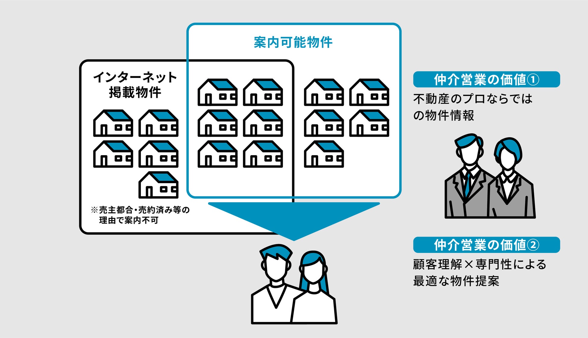 そういった背景から、不動産仲介においては担当営業の独自の物件情報網と、深い顧客理解および専門知識をベースにした物件提案が重要になってくるのです。