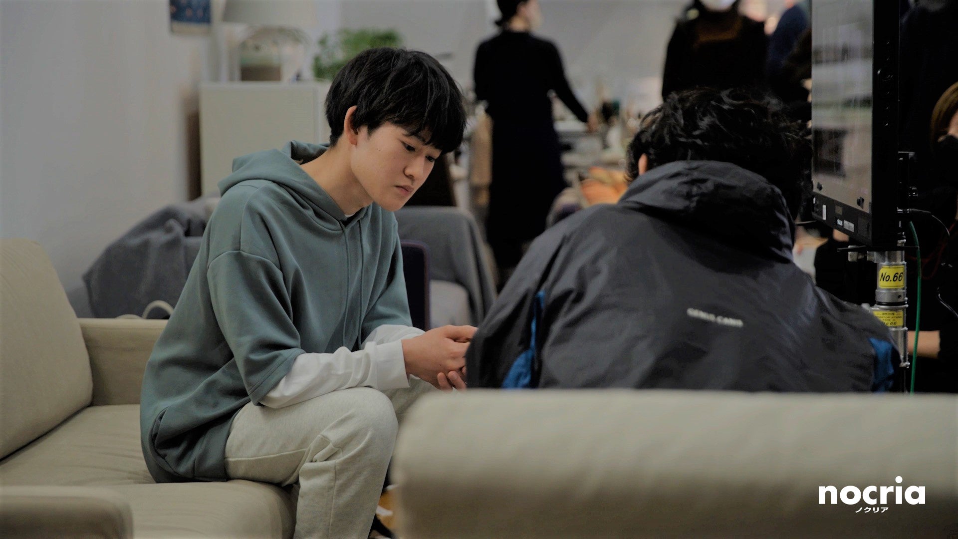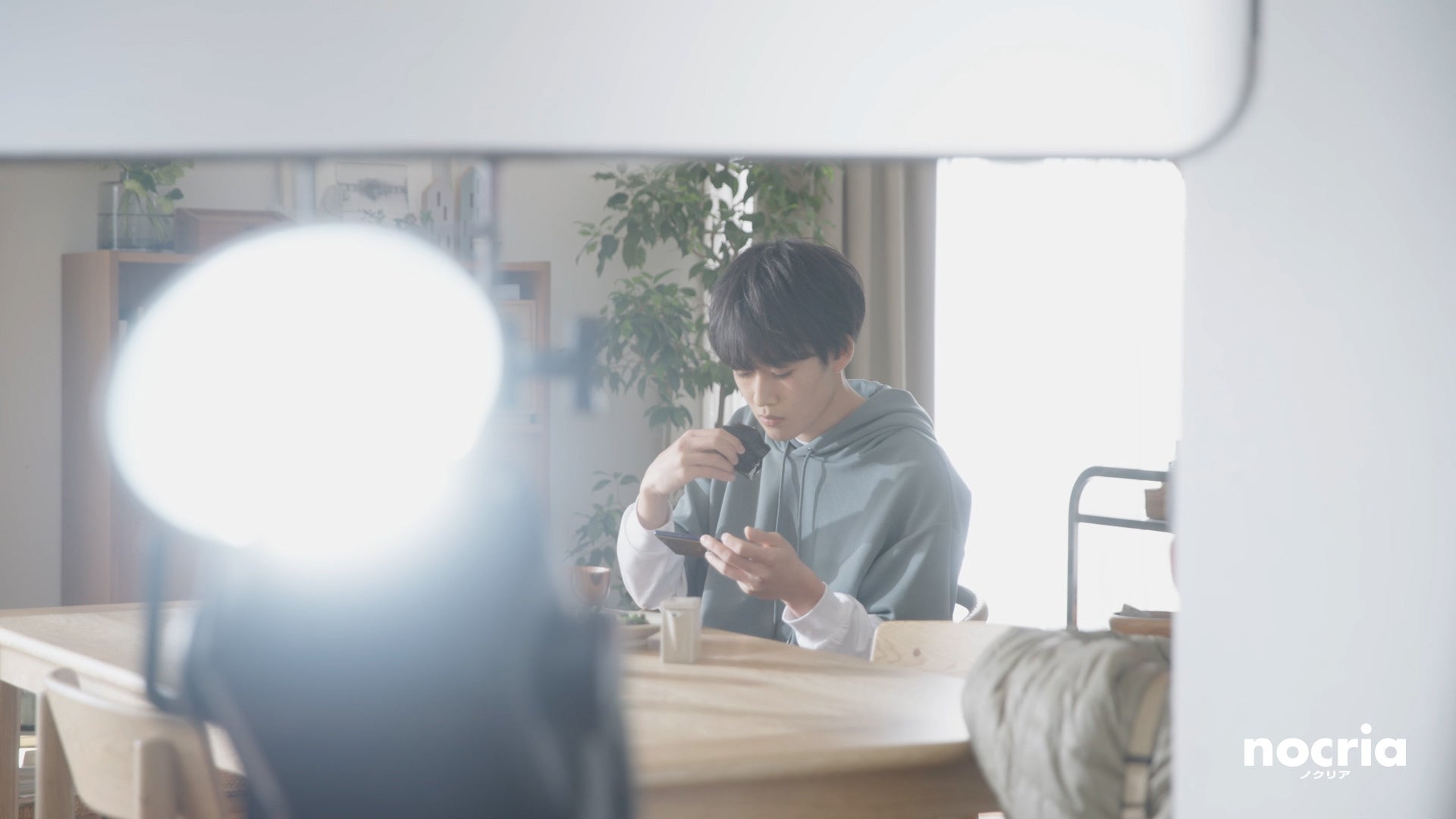 爽やかに「お願いします!」と挨拶をしながら山時聡真さんが現場に登場。スマートフォンを片手に動画を見ながらおにぎりを食べるシーン、ソファでイヤホンをしながら音楽を聴くシーン、それぞれのカットで一発目から「いいと思いました!めっちゃいいと思いました!」と監督から絶賛の声が上がりました。動きが少ない分、細かいタイミングや些細な仕草について監督から指示が飛びましたが、すぐさま対応し、現場スタッフからも17歳と思わせない高い対応力に「すごい!」と声が上がっていました。