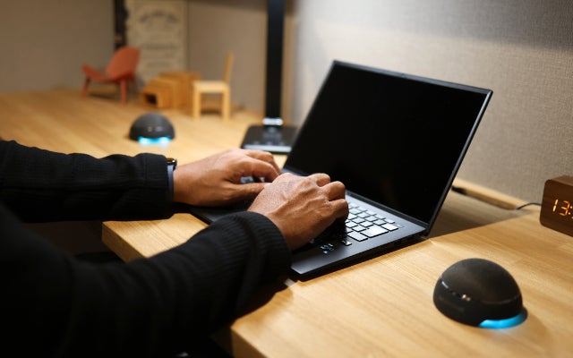 直径わずか9cmのコンパクト球体は、見た目に美しいだけでなく、付属のスタンドでデスクやベッドサイドにもすっきり置くことができる。