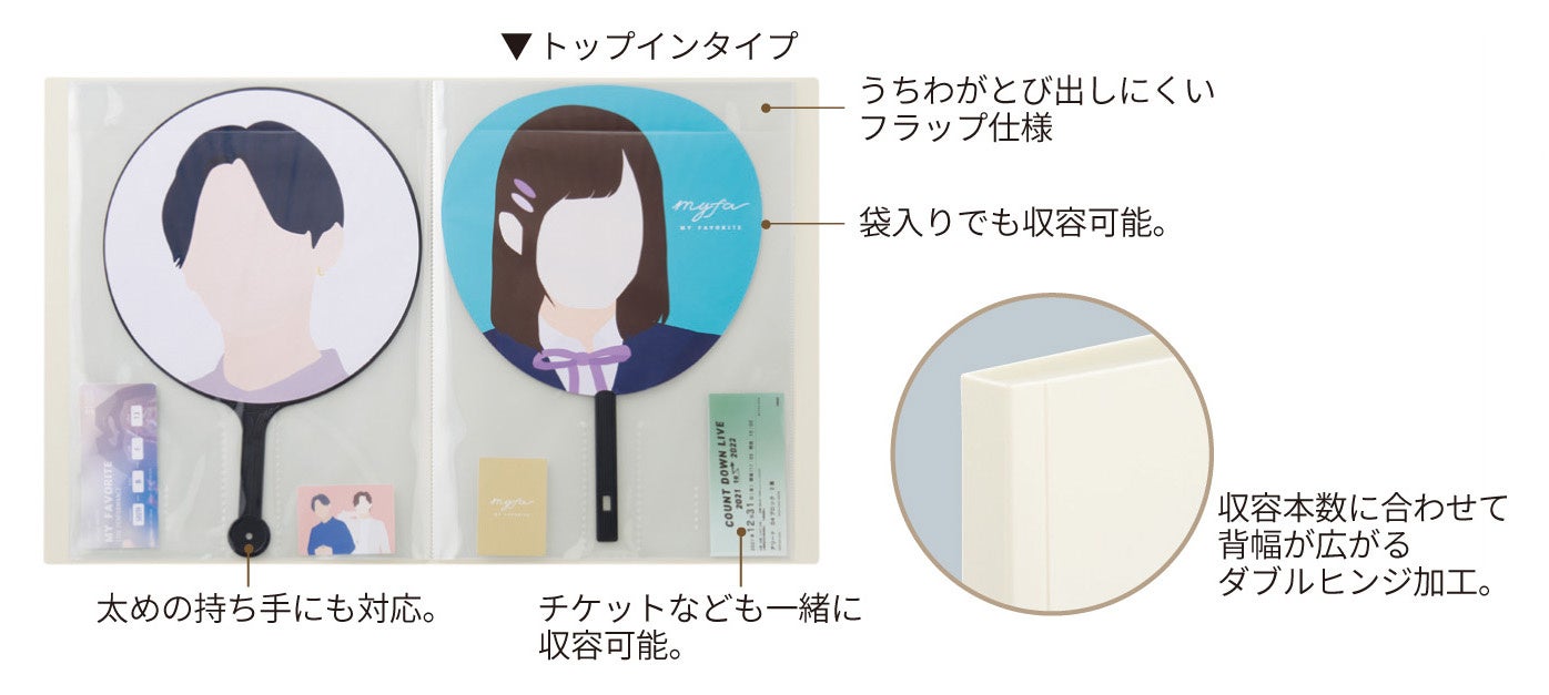 うちわの収納にぴったりなポケット固定式のクリヤーブックです。ジャンボうちわを想定したポケットサイズで、同じポケット内にチケットなども合わせて収納できるので、ライブごとにうちわとチケットを整理することができます。うちわの型が余裕のあるサイズ設計のため、持ち手が太いタイプのうちわや、購入時にうちわ本体が入っている袋のままでも収容可能です。ポケット上部はフラップ仕様で、うちわのとび出しを防ぎます。