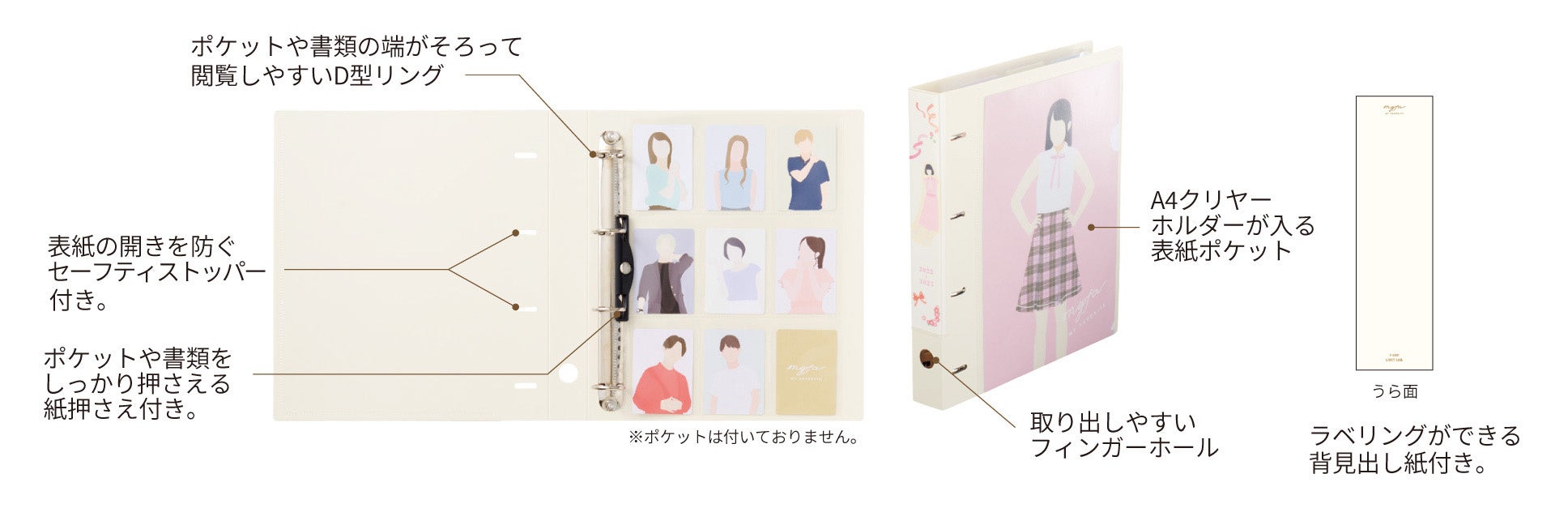 コレクションポケット各種(別売)と組み合わせることで、推し活グッズをまとめて保管できる4穴のD型リングファイルです。表紙にはA4のポスターやクリヤーホルダーが入るポケット付きで、オリジナル表紙を作ることができます。A4クリヤーホルダーの収容に対応するため、通常のD型リングファイルと比べて本体の高さが11mm大きい設計です。ラベリングやデコレーションがしやすいシンプルデザインの背見出し紙やファイルのゆがみを防ぐセーフティストッパー、収納物の垂れを防ぐ樹脂製紙押さえを付属しています。