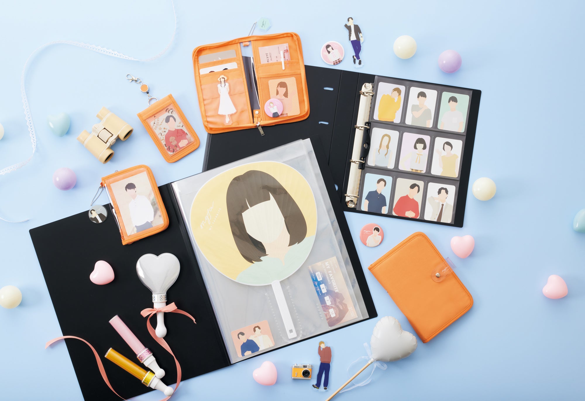 推し活グッズの持ち運びに便利な見開き式ポーチです。ミニサイズとスタンダードサイズの2サイズで展開いたします。外側の透明ポケットに付属の透明シートをデコレーションして挿入することで、自分だけのポーチを作ることができます。ミニサイズはカードポーチや文具小物の収納・パスポーチとして、スタンダードサイズはペンケースやトラベルポーチ・通帳ケースとしても活用いただけます。