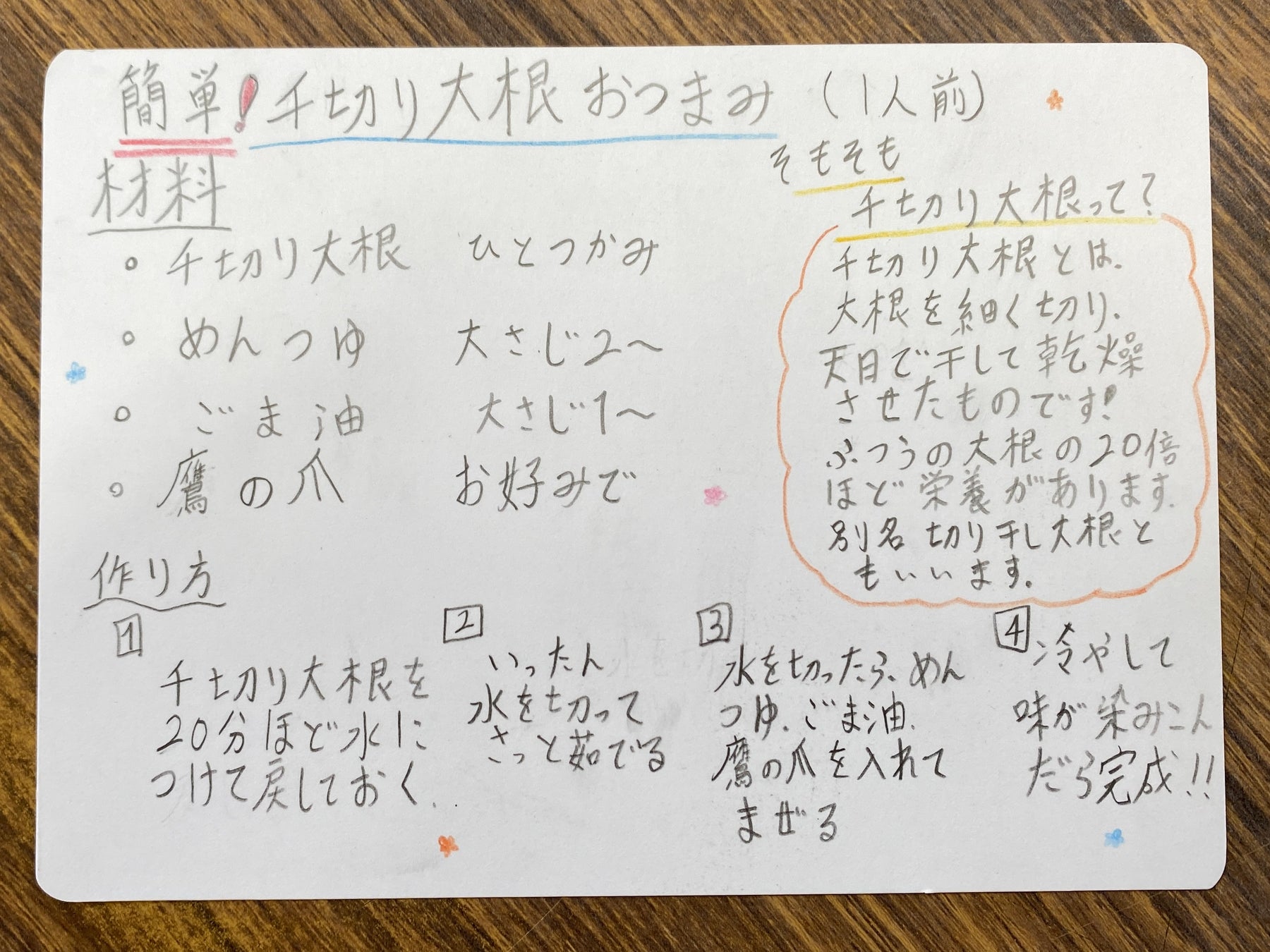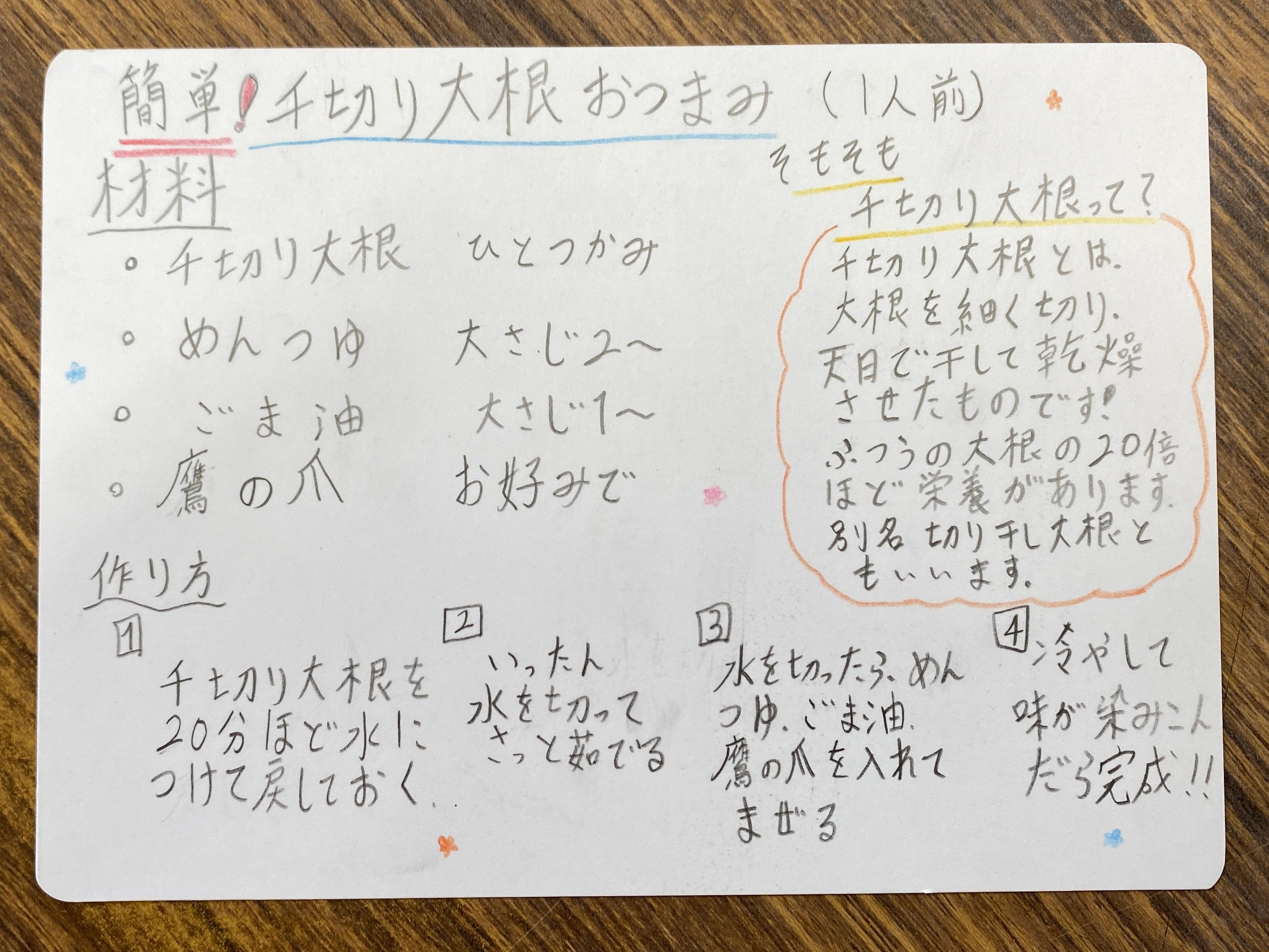 (写真)生徒が自筆したせんぎり大根(切干大根)のレシピ。学校のホームページからはレシピをみることもできる。