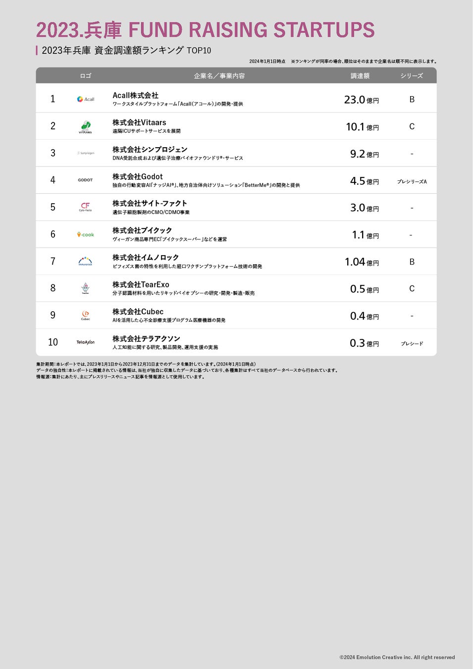 本レポートでは、兵庫県内に本社があり、調達額を発表しているスタートアップの資金調達額TOP10をまとめています。