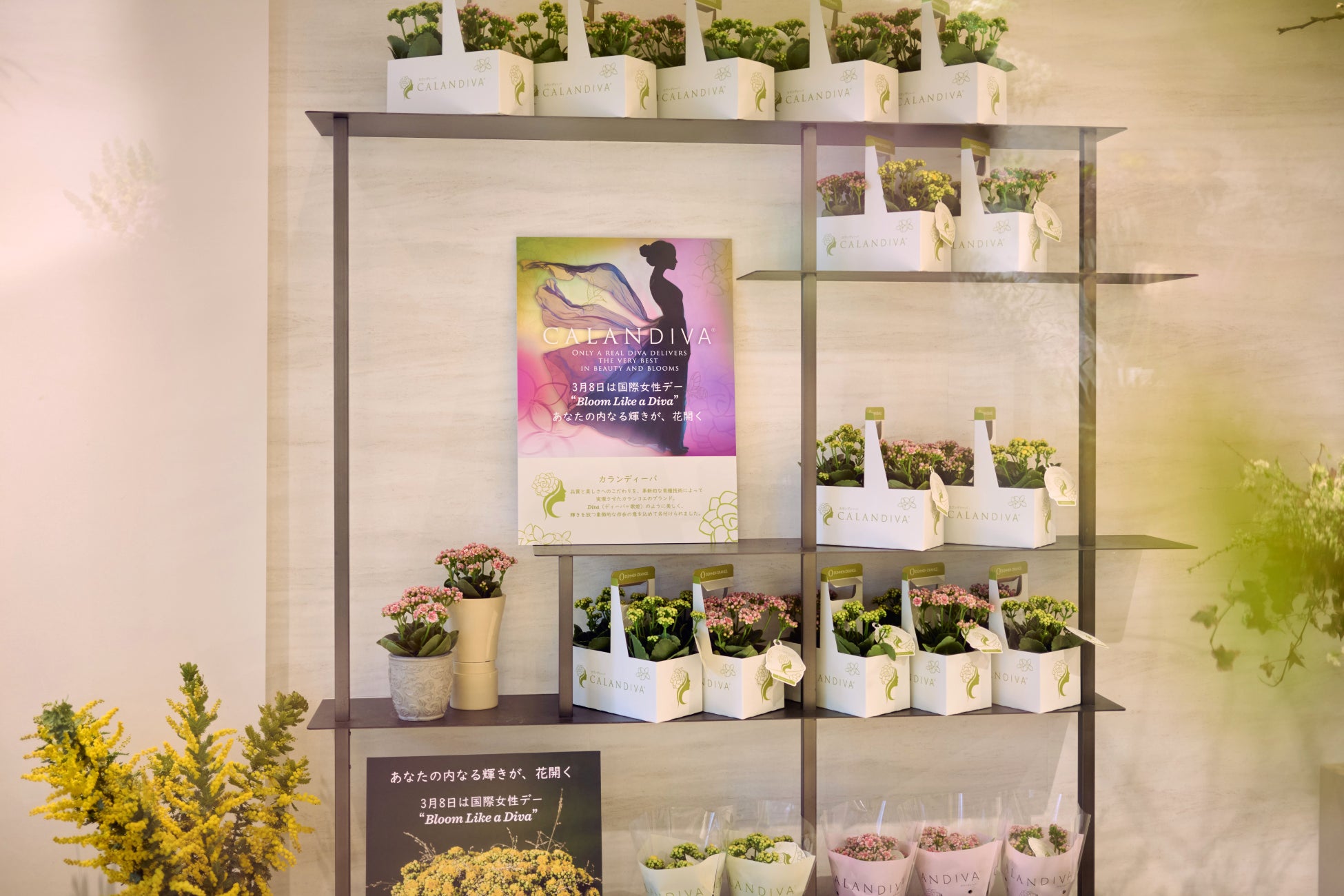 今年は、ジャデルトウキョウ(東京)やFukuoka Effect(福岡)をはじめとする一部の店舗にて、国際女性デーのシンボルカラーであるミモザイエローのカランディーバを用いた特別なプロモーションを展開。ブランドの世界観を表現する特別なギフトボックスやスリーブを用いた店頭ディスプレイを実施し、洗練された美しいディスプレイが訪れるお客様に、カランディーバの美しさと華やかさを存分に感じていただける空間を演出しました。