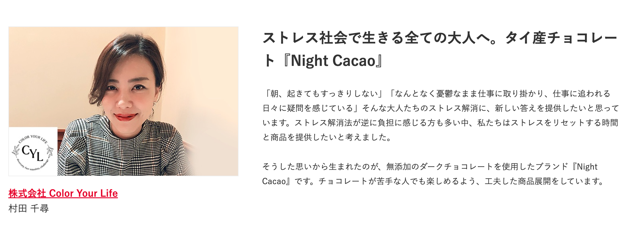 株式会社 Color Your Life(カラーユアライフ)は創業以来、「多様性を受け入れ、新しきを創る」をミッションに、タイにある自社農園のカカオを使用したチョコレートブランド“KOKODii(ココディー:タイ語で品質や健康に良いカカオという意味)”を展開し、夜に食べても健康的な「NightCacao(ナイトカカオ)」シリーズを提供しています。