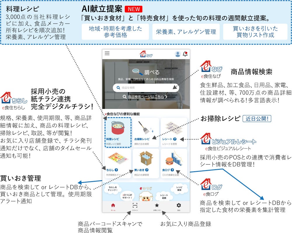 この「e食住なび/AI献立提案サービス」は、「e食住なび」が管理する「詳細な食材の商品情報データ」、電子チラシサービス「e食住ちらし」、自宅在庫管理機能「e食住なび/買いおきサービス」と生成AI技術を組み合わせることで、ユーザーが日々の食事の献立プランを簡単かつ効率的に計画できるサービスです。ユーザーは「e食住なび」に提供される食品スーパーの特売情報や自宅在庫を活用し、旬の食材を使ったバランスの取れた献立をAIによって提案されます。さらに、買い物リストの自動生成機能で、効率的な買い物が実現し、健康的で安全安心な食生活をサポートします。