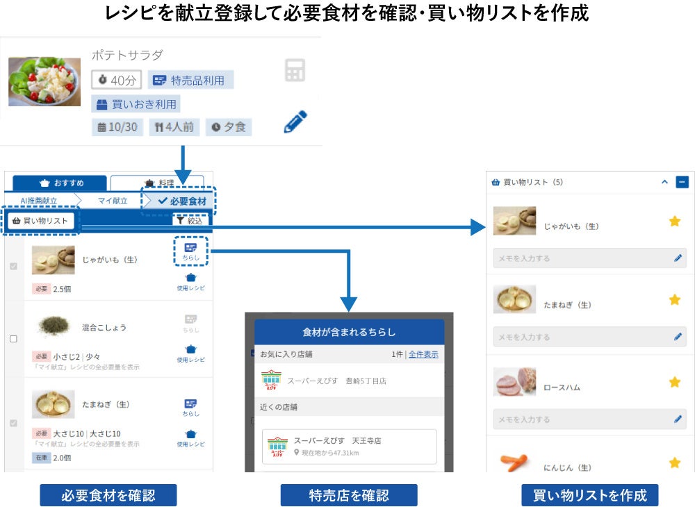 献立登録機能を活用することで、選んだレシピの必要食材を自動的に確認し、効率的な買い物リストを作成します。特売店も確認でき、必要な食材を見逃さず、スムーズな買い物が可能になります。