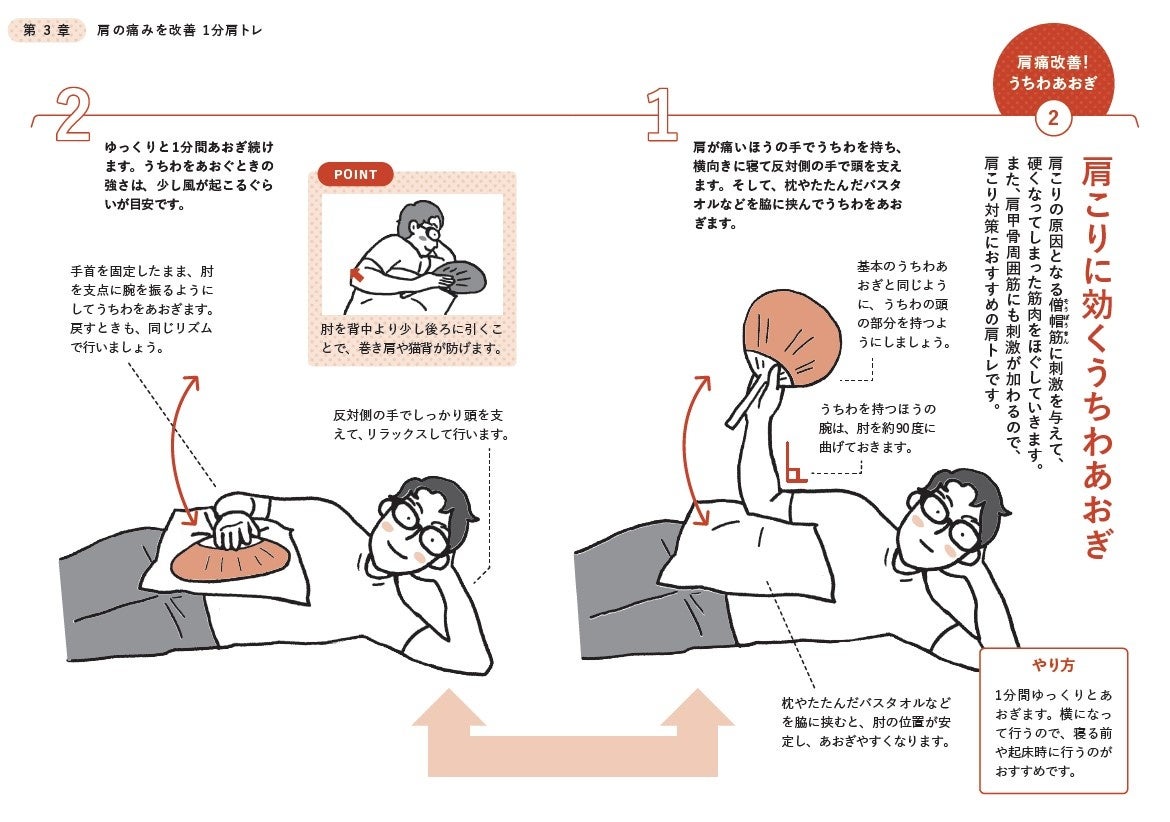 肩の治療迷子になってしまう要因は大きく2つあります。1つめは「肩こり・五十肩・腱板断裂」という肩の悩みの3大原因に対する最新の知識が不足していることです。この最新かつ医学的根拠がある知識を、わかりやすさにこだわって解説したのが本書です。治療迷子の要因2つめは、肩の治療に必要なエクササイズを継続できないことです。肩はインナーマッスルという筋肉がとても重要な働きをしています。そのインナーマッスルを刺激するエクササイズが治療において大切になるのですが、多くの人にとって、それを継続することが難しい課題になっています。そこで、この本では「うちわあおぎ」というとても簡単で継続しやすいエクササイズを提案しています。「うちわあおぎ」はうちわに限らず、扇子やクリアファイルでも下敷きなど、あおげる物であれば代用可能です。