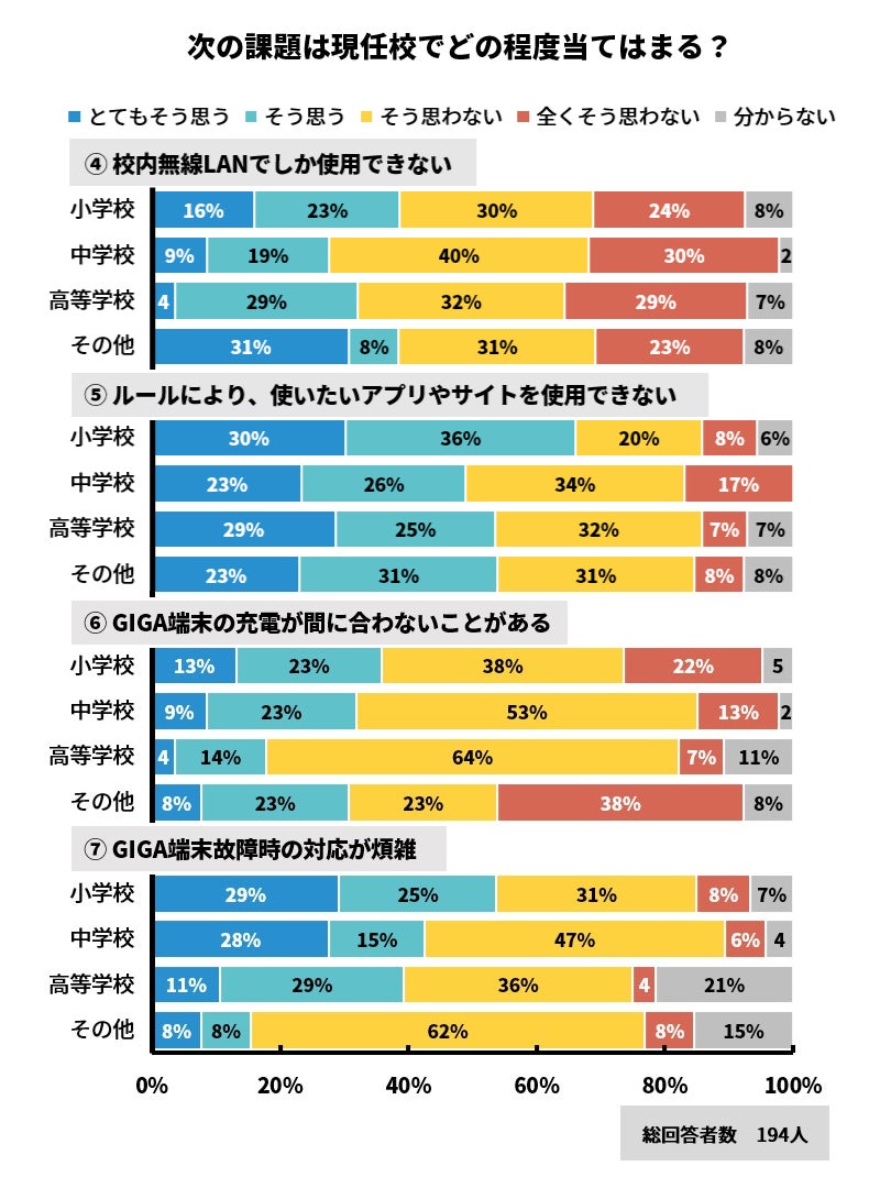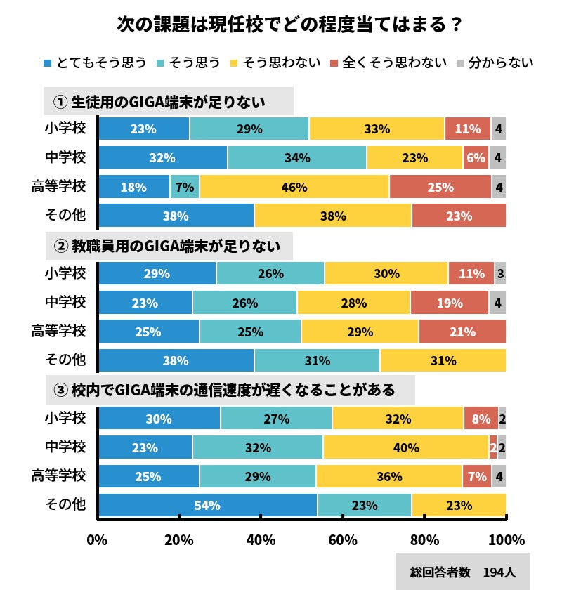 課題として最も多く上がっていたのは、小学校では「ルールにより、使いたいアプリやサイトを使用できない(66%)」、中学校では「生徒用のGIGA端末が足りない(66%)」、高等学校では「校内でGIGA端末の通信速度が遅くなることがある(54%)」「ルールにより、使いたいアプリやサイトを使用できない(54%)」でした。自由記述の回答では、ICTに詳しい専門家の不足やGIGA端末を学習に活かすことの難しさ、学校によるルールの違いを訴える声もありました。