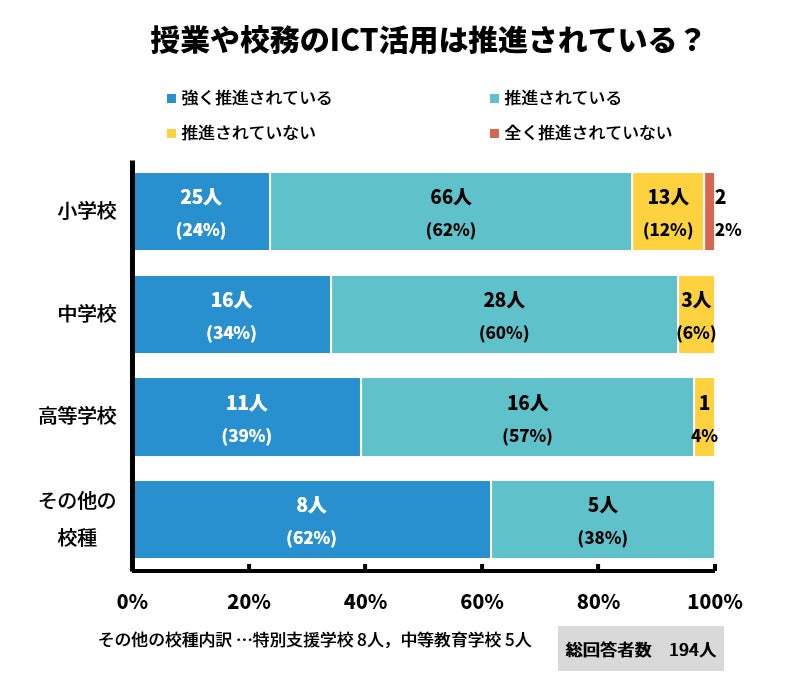 小学校では24%が「強く推進されている」と回答し、62%が「推進されている」と評価。中学校と高等学校も相対的に高い割合でICTを推進しており、それぞれ34%と39%が「強く推進されている」と回答しています。その他の校種でも62%が「強く推進されている」と答え、全体的にはICTの導入が進んでいることがわかります。