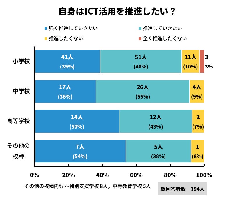 全体的にICT活用を推進する意欲が高い傾向が見られます。小学校では39%、中学校や高等学校も、36%と50%が「強く推進していきたい」と回答し、ICTの積極的な導入に前向きな姿勢が見受けられます。全体的に「推進していきたい」割合も高く、ICTを教育現場で有効に活用したいという共通の意欲が示されています。また、全く推進したくないと回答した割合は低く、教職員全体がICTの導入に肯定的な態度を持っていることが伺えます。