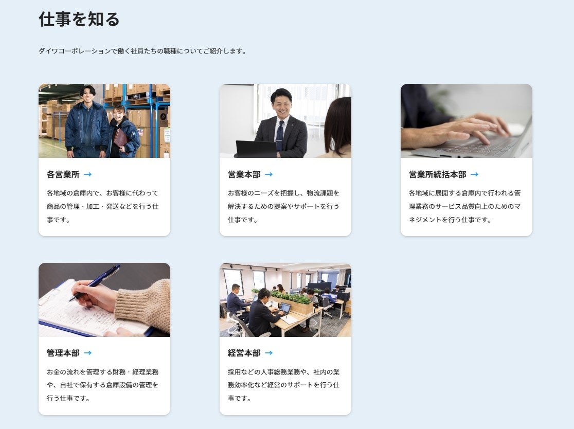 コロナ禍でエッセンシャルワーカーとして認知されたためか、物流業や倉庫業に興味を持ち、当社の採用イベントに参加する学生が増えています。タイムパフォーマンス重視の学生のニーズに応えるため、業界研究の時点で参考になる企業を目指し、「業界を知る」「ダイワを知る」「仕事を知る」といったコンテンツを新たに用意しました。また、これまでのサイトと同様に、社長メッセージや福利厚生、研修の紹介、社員インタビューなど、社員の写真を多く用いさまざまな角度からダイワコーポレーションを知っていただけるコンテンツを企画しています。