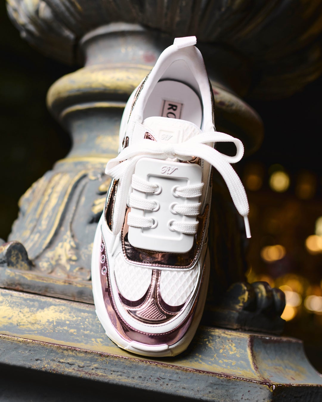 サヴォアフェールとパリジェンヌのエッセンスを表現したヴィヴ オン ザ ランの核心は、紛れもなくロジェ ヴィヴィエなのです。快適でありながら格調高く、楽しくエレガントで、伝統的なノウハウと革新的なデザインに根ざしています。このデザインは、1959年に発表されたメゾンのアイコンであるショック ヒールを受け継ぎ、進化させたものです。スティレットヒールの鋭さを和らげるように内側にへこんだ形で知られるショック ヒールは、足のバランスを整え、女性の靴に革命をもたらしました。現代のスニーカー用に再構築された厚底ソールとミッドソールは、履き心地の良さと洗練された美しさのバランスを保ち、さりげなくシックでありながら、決して誇張されません。