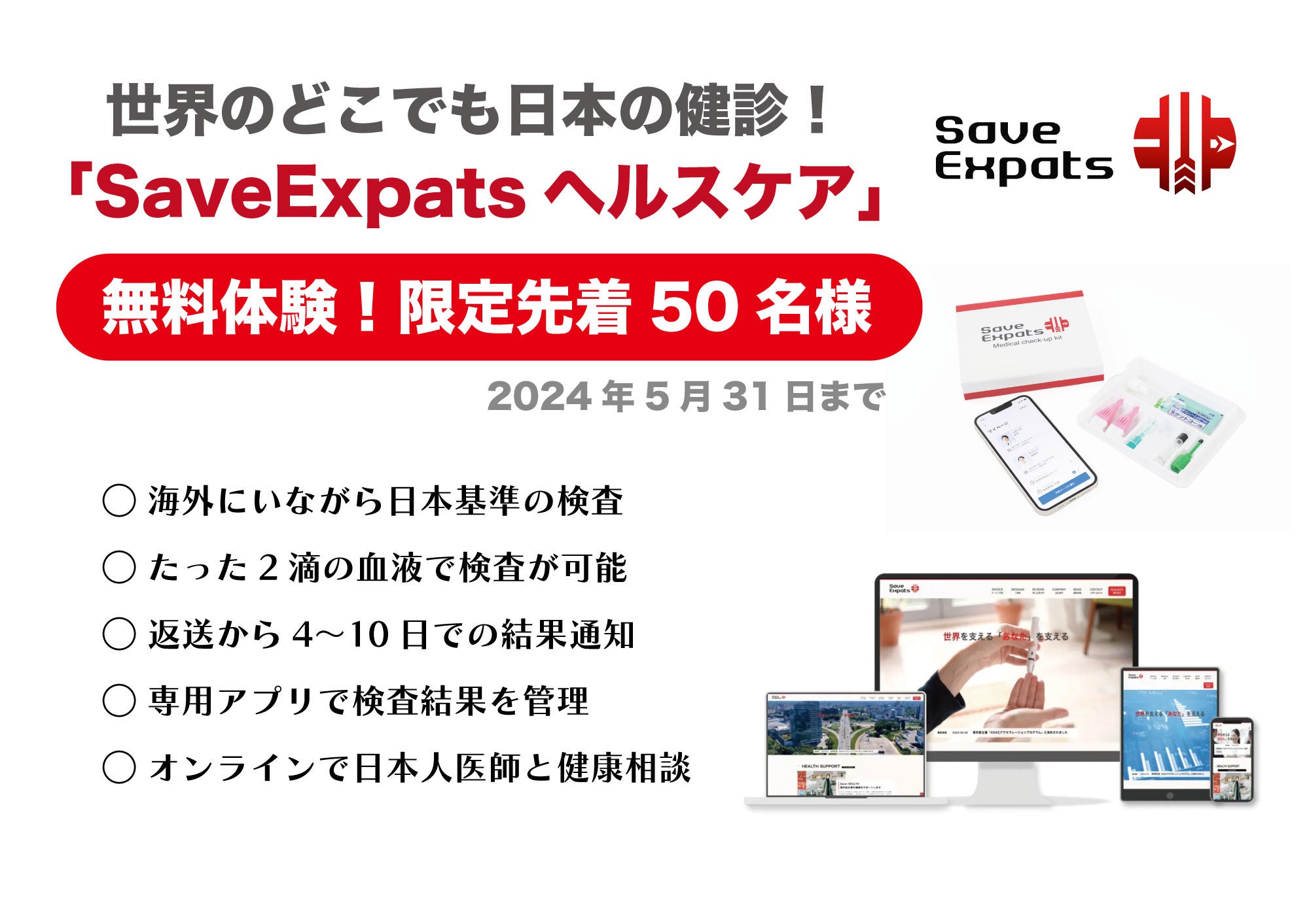 今回の個人向けサービス提供開始を記念して、2024年5月31日までにお申込みいただいた先着50名様に、保健師との面談を含む「SaveExpatsヘルスケア」の無料体験を特別に提供します。現在海外にお住まいの皆様や、海外で生活するご親族をお持ちの皆様、この機会に是非お試しください。一人ひとりに寄り添った健康支援サービスを通じて、より良い海外生活を実現しませんか?