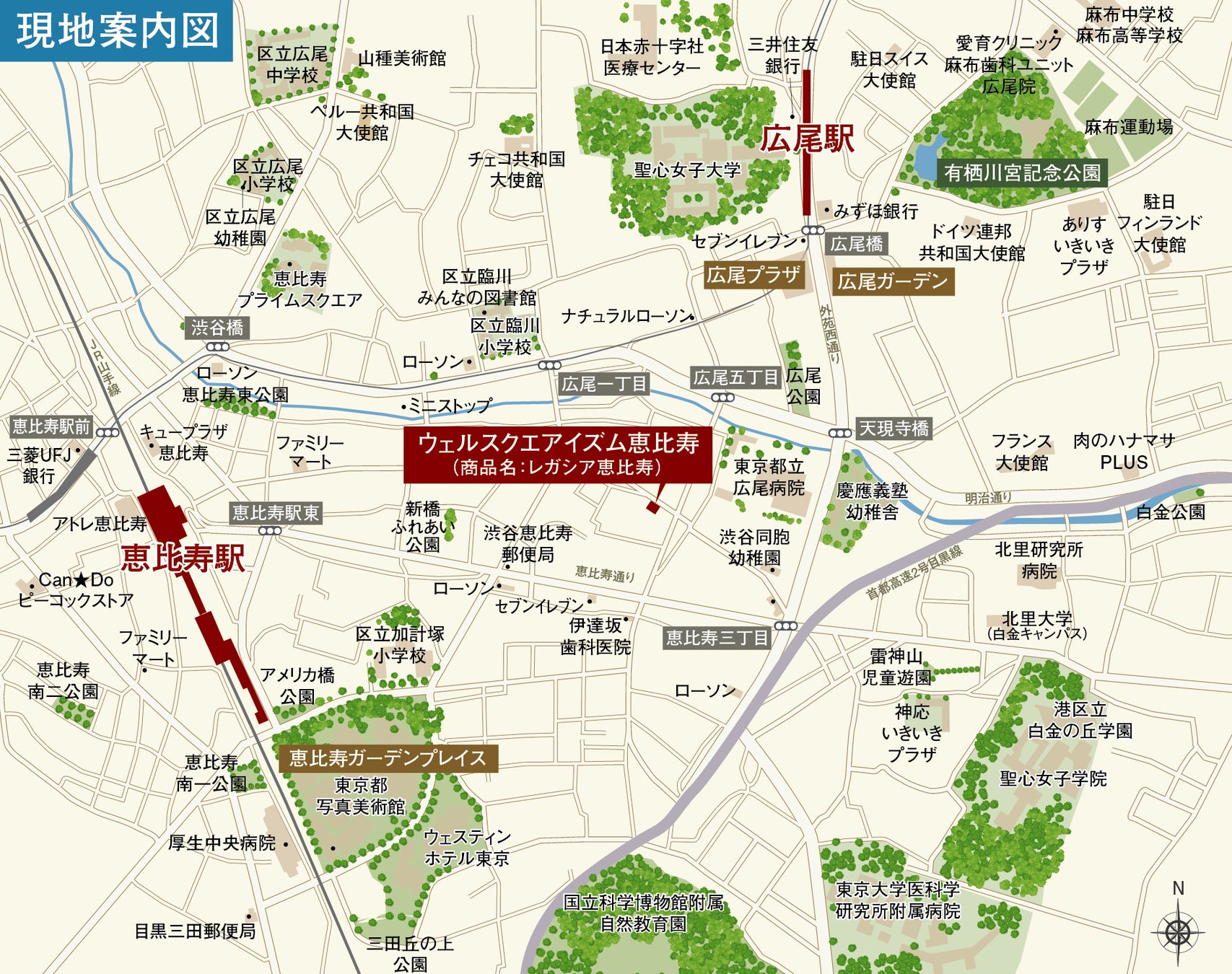 交通 | JR山手線、JR埼京線、JR湘南新宿ライン「恵比寿」駅徒歩11分 東京メトロ日比谷線「恵比寿」駅徒歩14分 東京メトロ日比谷線「広尾」駅徒歩9分 |