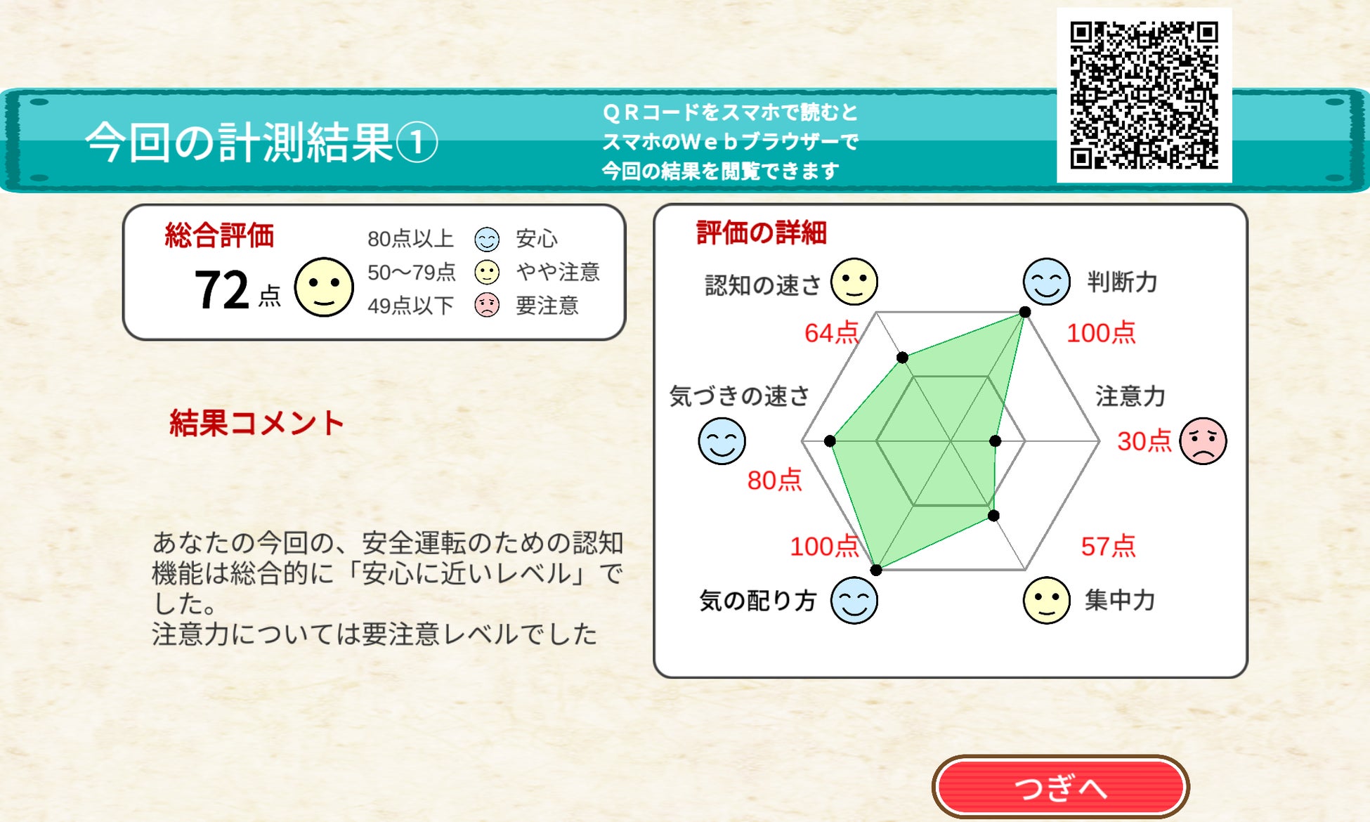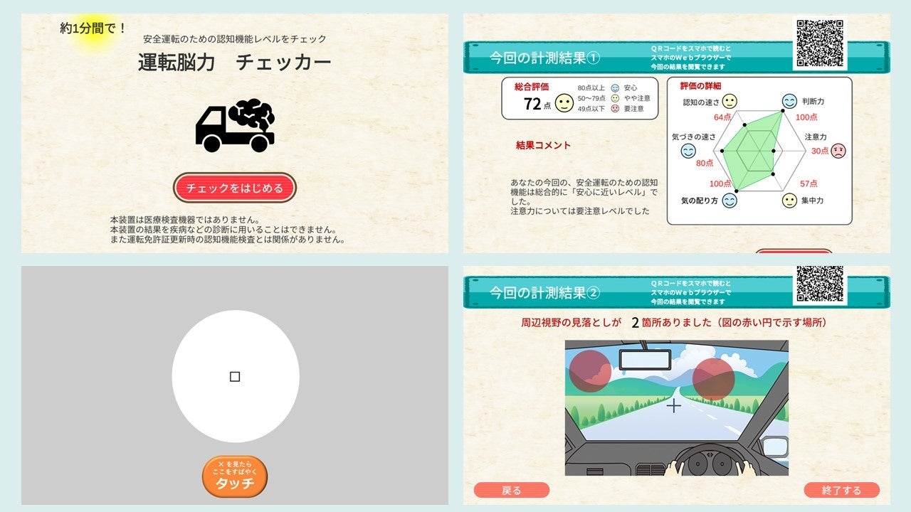 この「運転脳トレ」実施において、「運転脳力チェッカー」は効果測定のための定期的なチェックとして用いることで、より客観的に改善の効果を把握することが可能になると考えます。