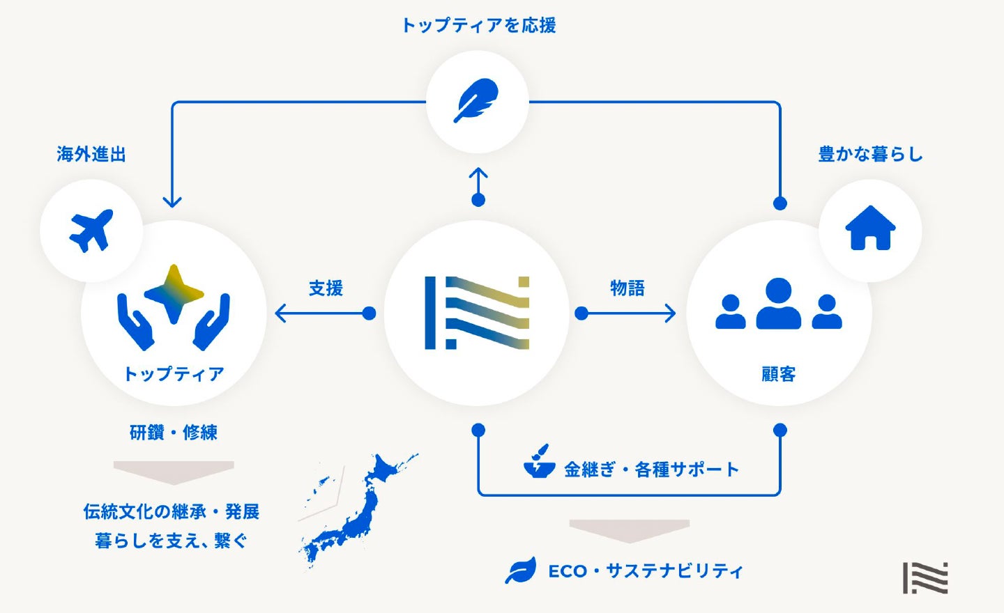 長い時間を経て育み、継承されてきた日本の伝統工芸文化は今、少子高齢化や東京一極集中などの理由により消滅の危機に晒されています。当社はこの文化を維持・継承することで日本の誇りを守ると同時に、新たなエコシステムを形成し、国内外でさらなる発展を遂げられないかと事業に挑戦しています。