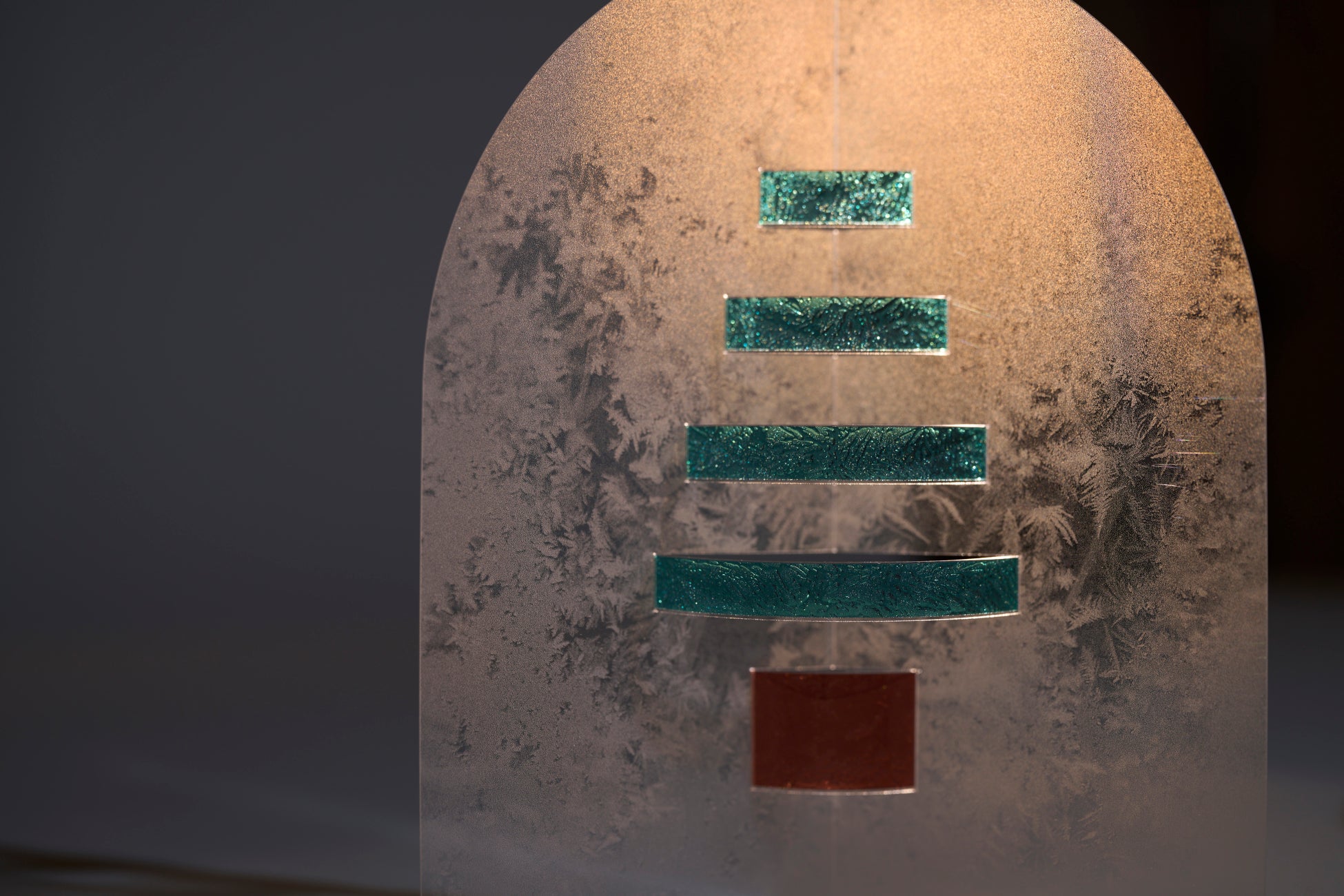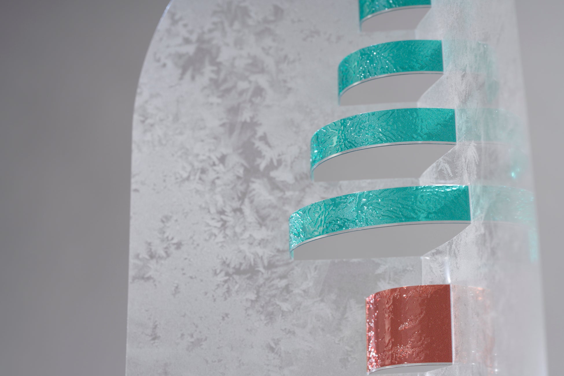 特殊印刷技術を活かし、ステンドグラスのようなキラキラ感や微細な霜の模様を表現しつつ、軽くてかさばらないインテリアを実現しました。