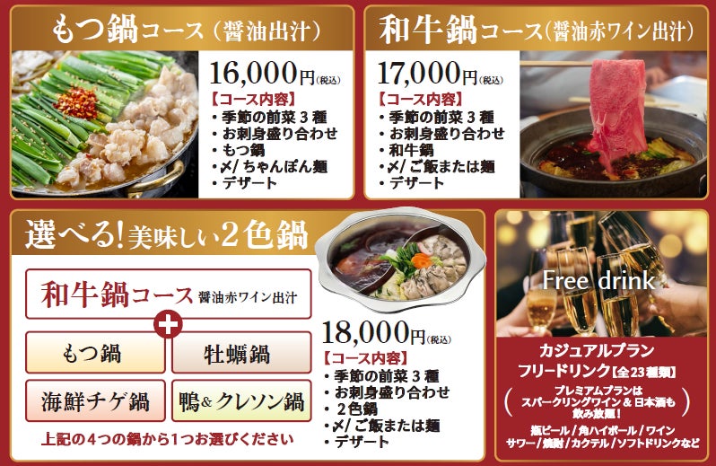 「もつ鍋」「牡蠣鍋」「海鮮チゲ鍋」「鴨&クレソン鍋」4つの鍋から1つお選びいただけます。