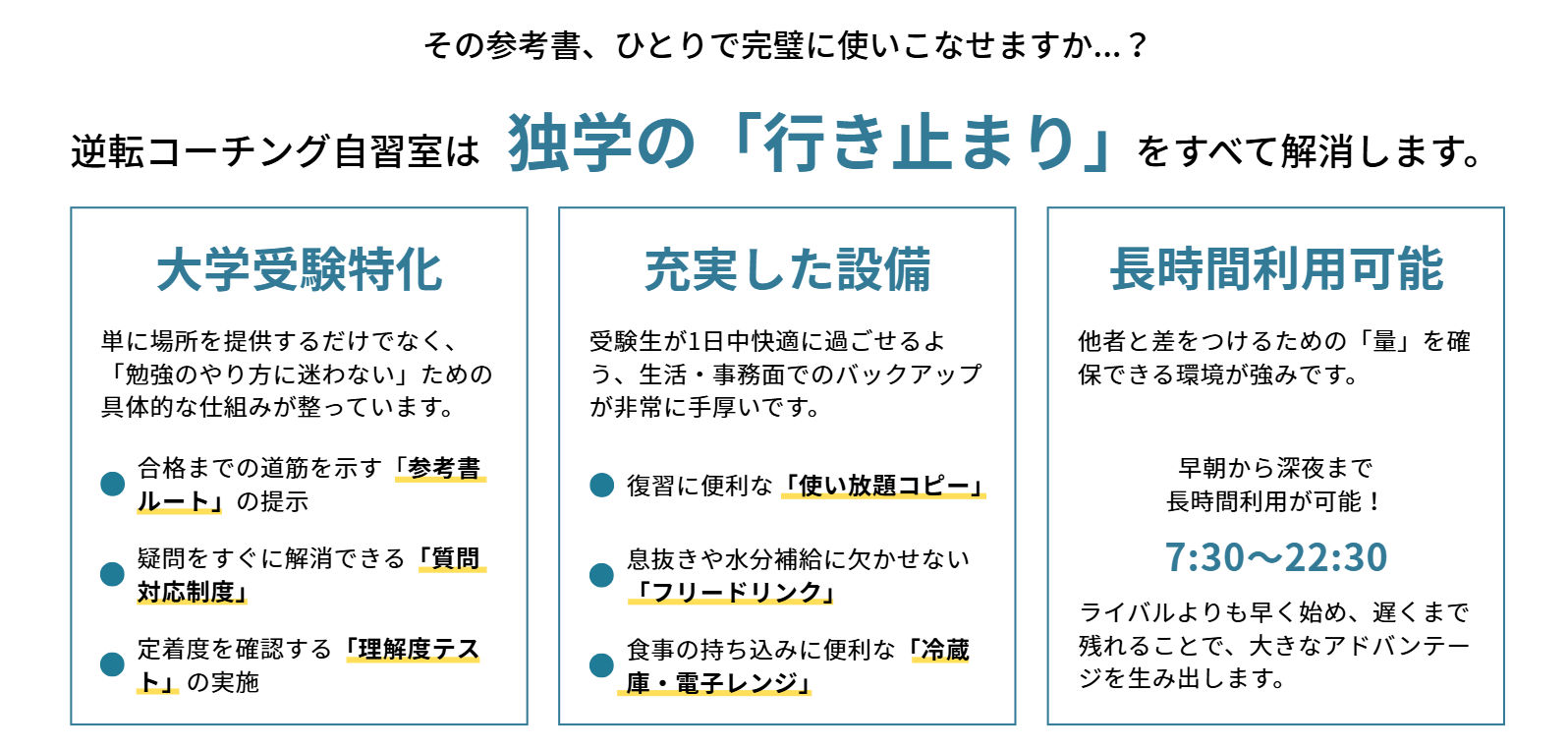受験生は量を確保することは必須です。その中で逆転コーチング自習室は、基本的に休みは無く朝から夜遅くまでご利用をいただけます。他の受験生よりも早く始め、夜遅くまで質の高い学習を行うことで、本番までには大きなアドバンテージを作ることができます。