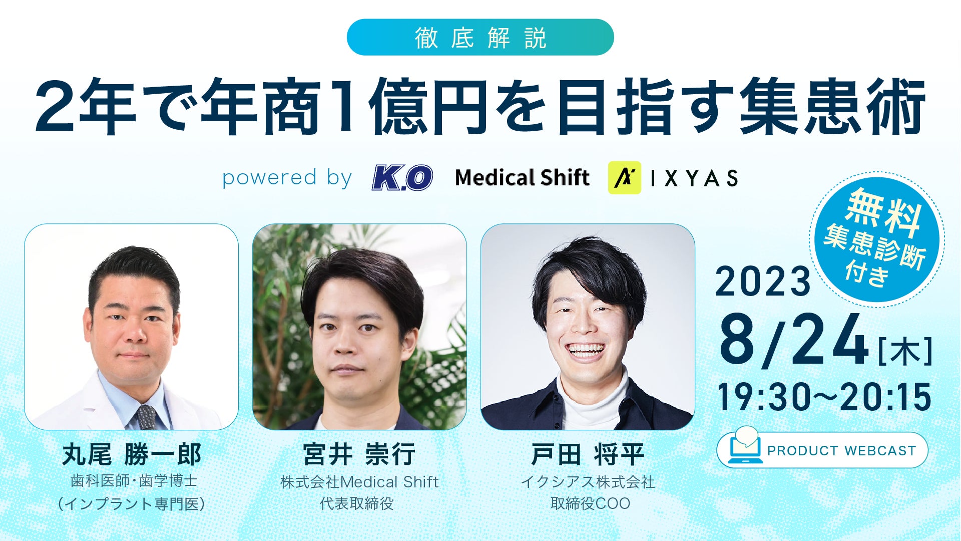 イクシアス株式会社がケーオーデンタル株式会社、株式会社Medical Shiftと共同で無料セミナー~2年で年商1億円を目指す集患術~を開催