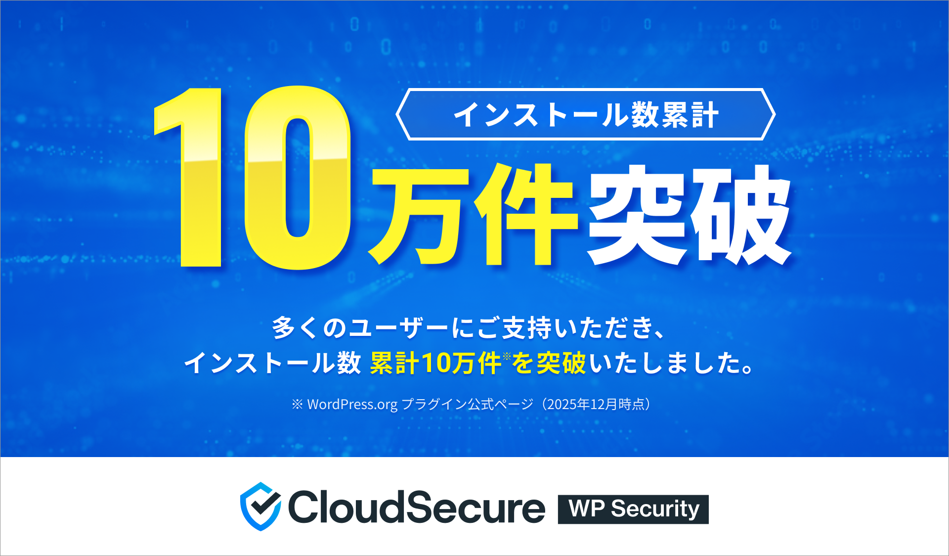 2025年12月、クラウドセキュア株式会社(本社:大阪市北区、代表取締役:本橋大介)が提供するWordPressのセキュリティ対策プラグイン『CloudSecure WP Security』のインストール数が累計10万件(※1)を突破したことをお知らせいたします。