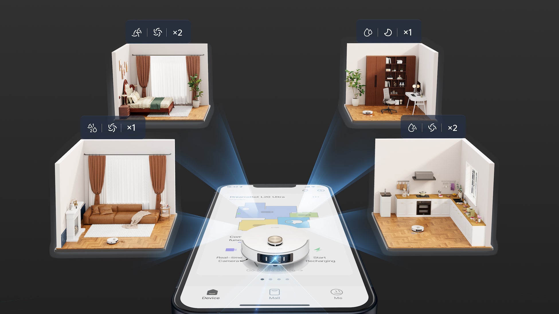 L20 Ultra Completeはアプリを使って思い通りのカスタム清掃が可能です。部屋のエリア分けや走行禁止エリアの設定、吸引のみのお掃除や拭き掃除のみの設定などのような細かい掃除指令もアプリで簡単に設定でき、満足のいくカスタム清掃を実現します。