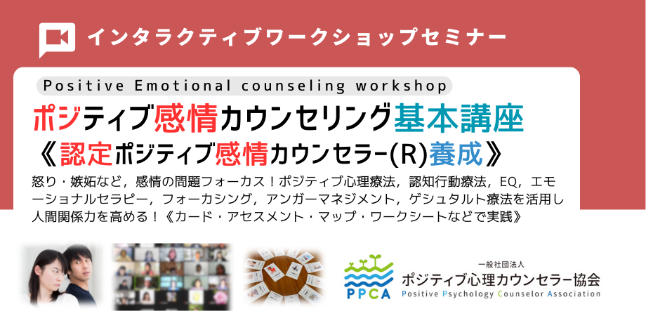 一般社団法人 ポジティブ心理カウンセラー協会(本部:東京都港区)が主催する、2024年3月2-3日 9:00~ 17:30(2日間・両日)までオンライン・ワークショップにて【ポジティブ感情カウンセリング基本講座」を開催いたします。オンラインですので,国内・海外など,どこでも受講可能です。