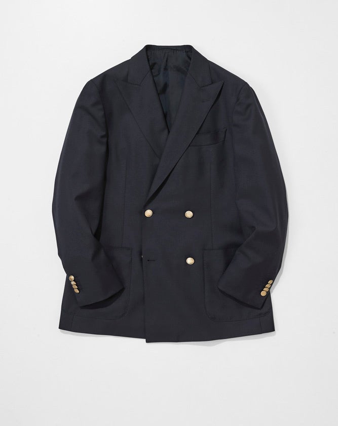 英国海軍「ブレイザー号」の制服を由来とするダブルブレステッドジャケットをベースに、マリンブルーストライプの裏地や、イカリが刻印されたメタルボタンを採用したブレザー。
