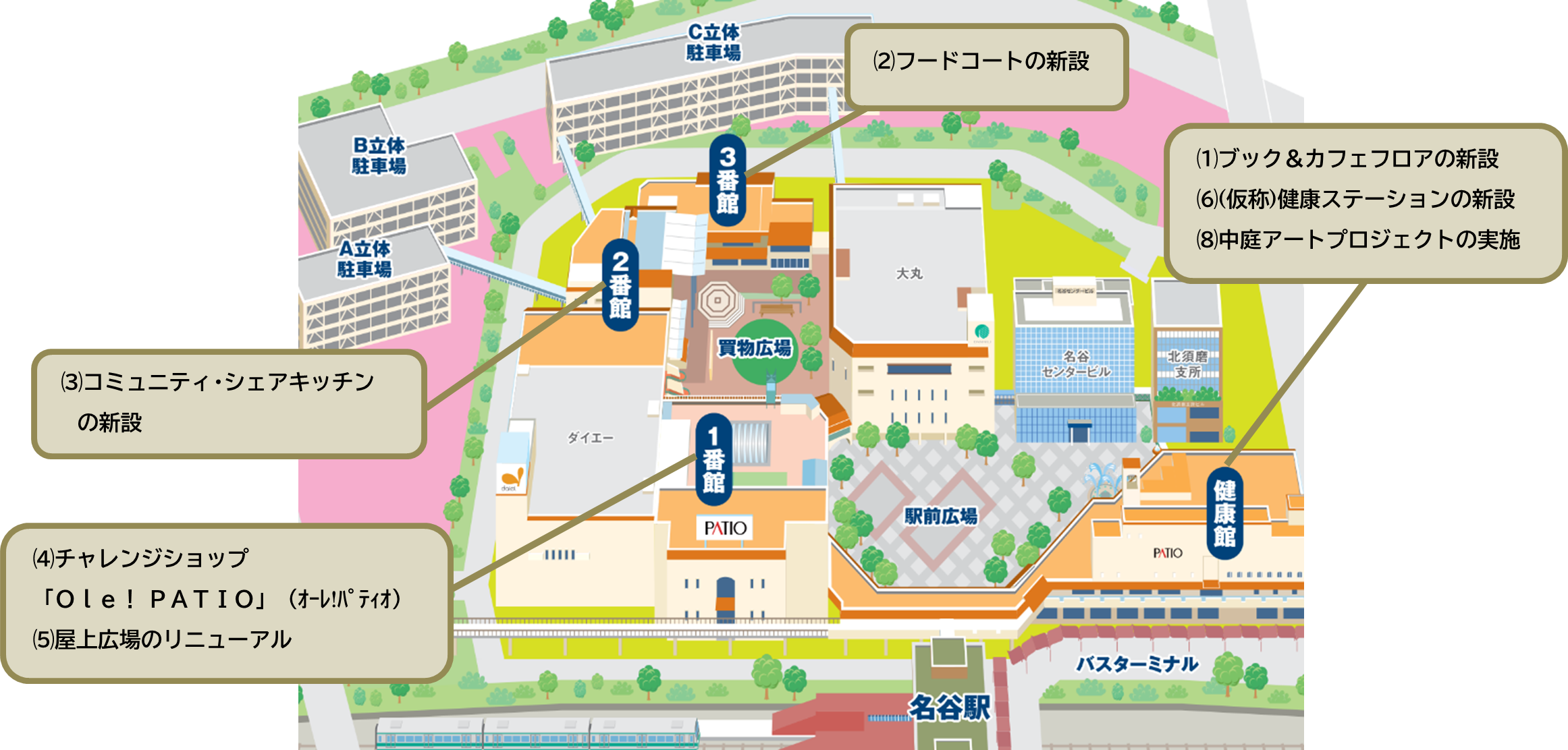 また、ベビールームを現在の1番館1・2階に加えて、3番館1階と健康館2階にも新設することで、施設内どこでも安心してお買い物やお食事をお楽しみいただけるようにします。