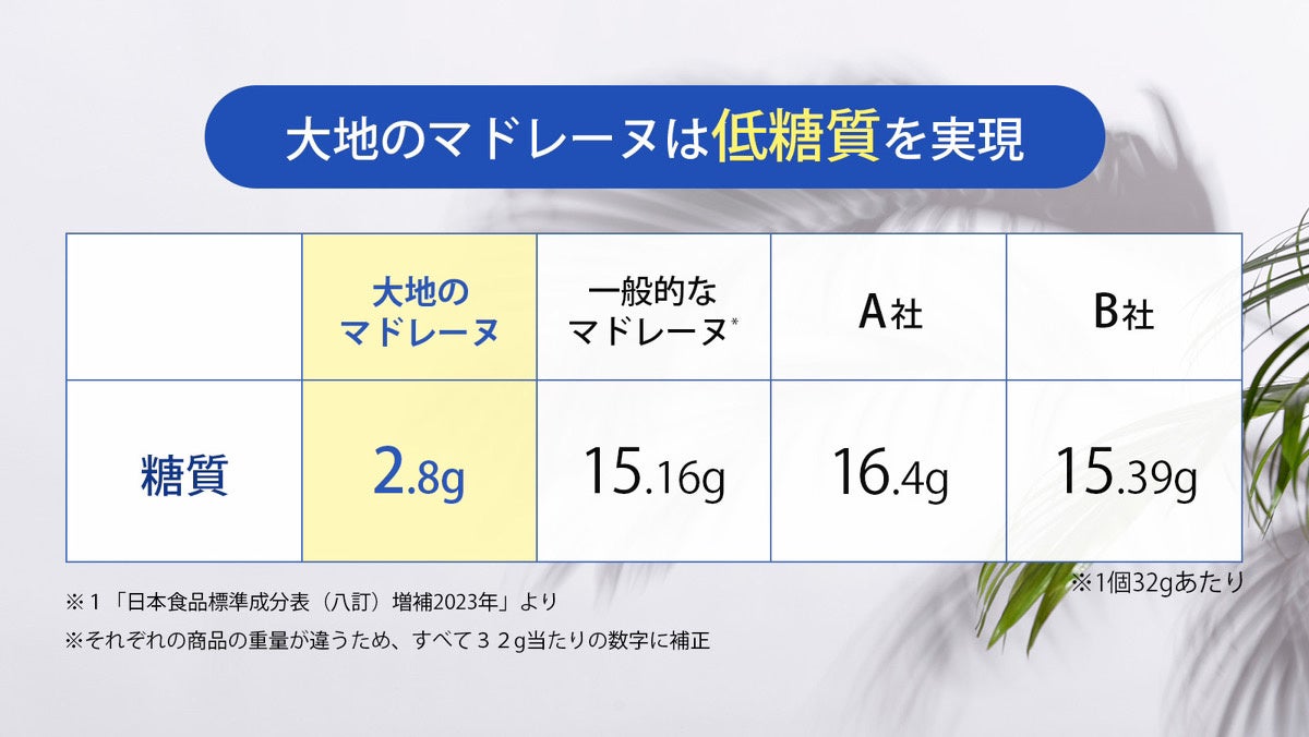 「大地のマドレーヌ」は、1個当たり(32g)に含まれる糖質がわずか約2.8g、食物繊維は5.4gと健康を強く意識した次世代型マドレーヌです。