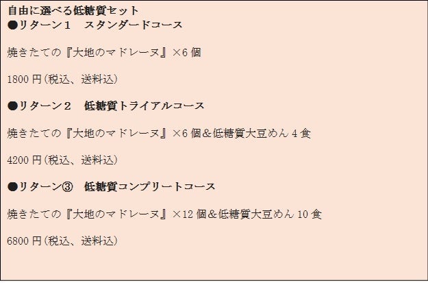 『大地のマドレーヌ』は、2024年4月1日より、クラウドファンディングサイト「Makuake(マクアケ)」にて応援購入を開始いたします。先行予約販売では、お得な割引価格で購入可能となり、リターンでは焼きたての『大地のマドレーヌ』をお届けするだけではなく、低糖質大豆めんとのセットで主食とおやつの「低糖質セット」もご用意しています。