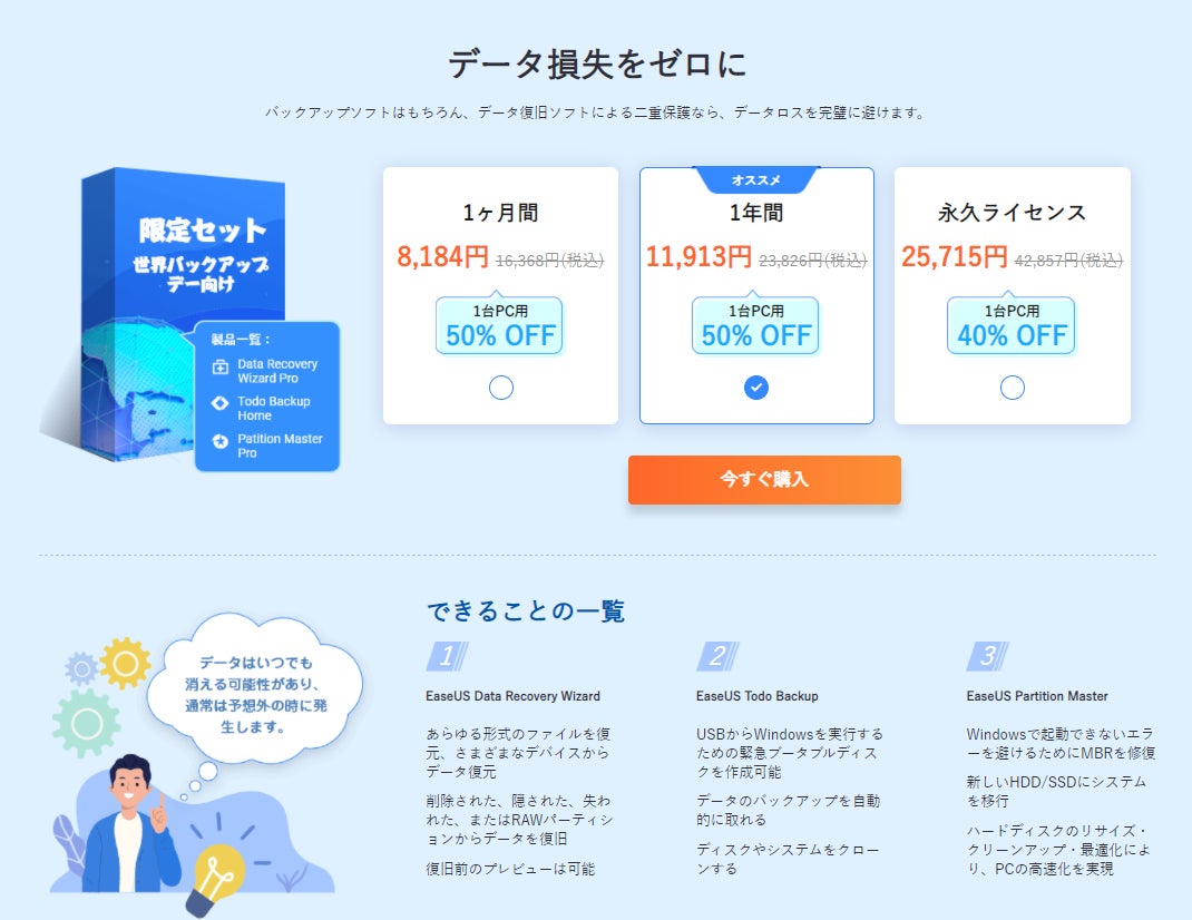 毎年3月31日はデータ保護を喚起するための「World Backup Day」(世界バックアップデー)です。この機に、最高な保護をあなたのデジタル資産にお届けします!データのバックアップはもちろん、データ復旧ソフトやパーティション管理ソフトによる三重保護なら、データ紛失を完璧に避けます。