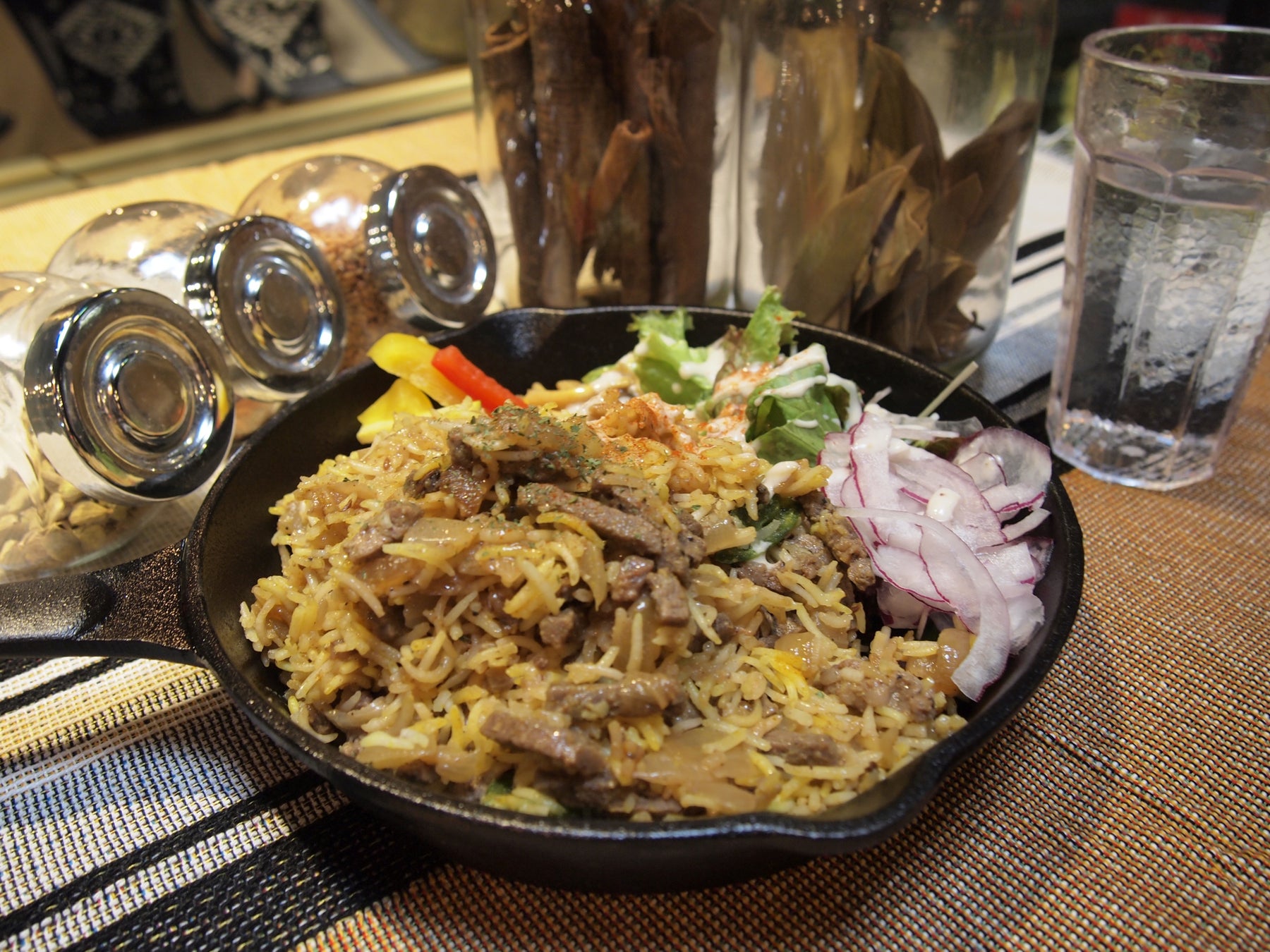 10種類以上のスパイスで付け込んだ牛肉と香り高いバスマティライスをスキレットで蒸し焼きにしたビリヤニ。