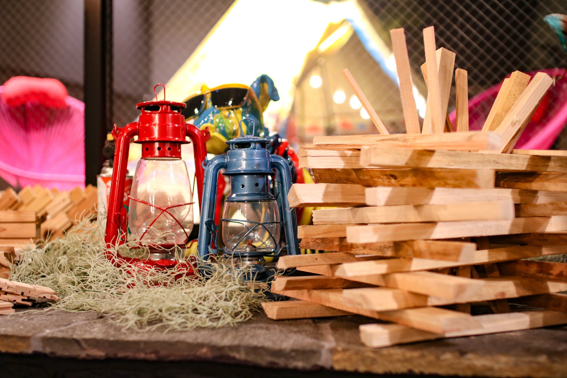 テント、ハンモック、テーブル、椅子など店内はアウトドアギアで作られており、