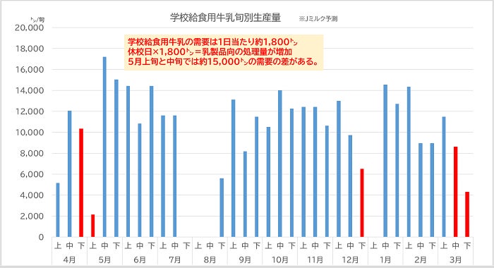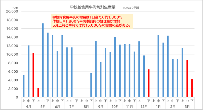 春休みやGWには、学校給食がありません。また、GWには多くの会社や官公庁なども休みで社会経済活動が止まりますので、牛乳の需要が一時的に大きく減ります。