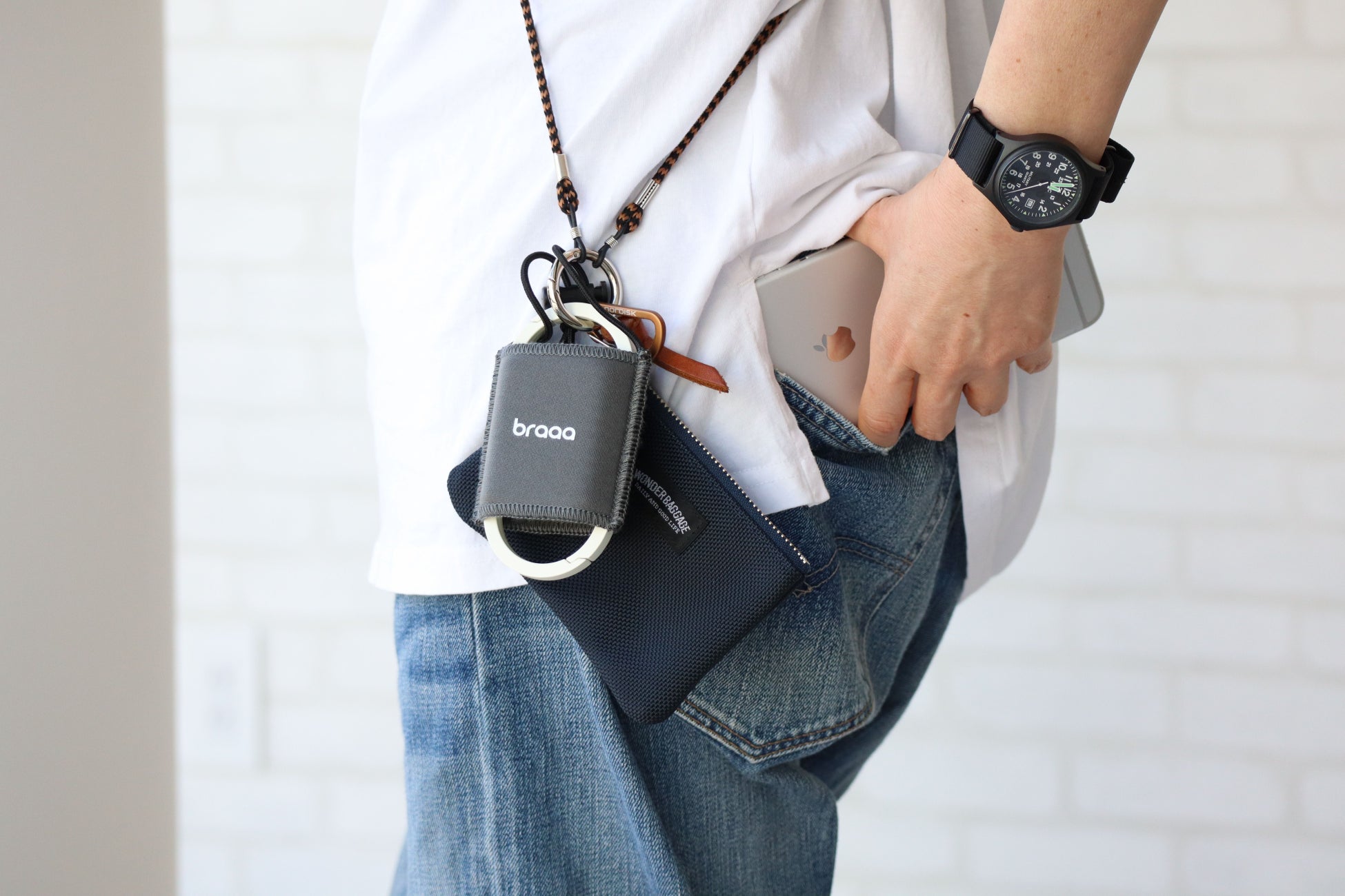 canox本体の亜鉛合金Wフックカラビナは耐荷重5kgと堅牢な設計。canox専用カバーはウェットスーツなどに使われる素材で、弾力ある肉厚生地が衝撃を吸収。canox本体の機械部分を保護することで、カラビナとしての用途も広がります。