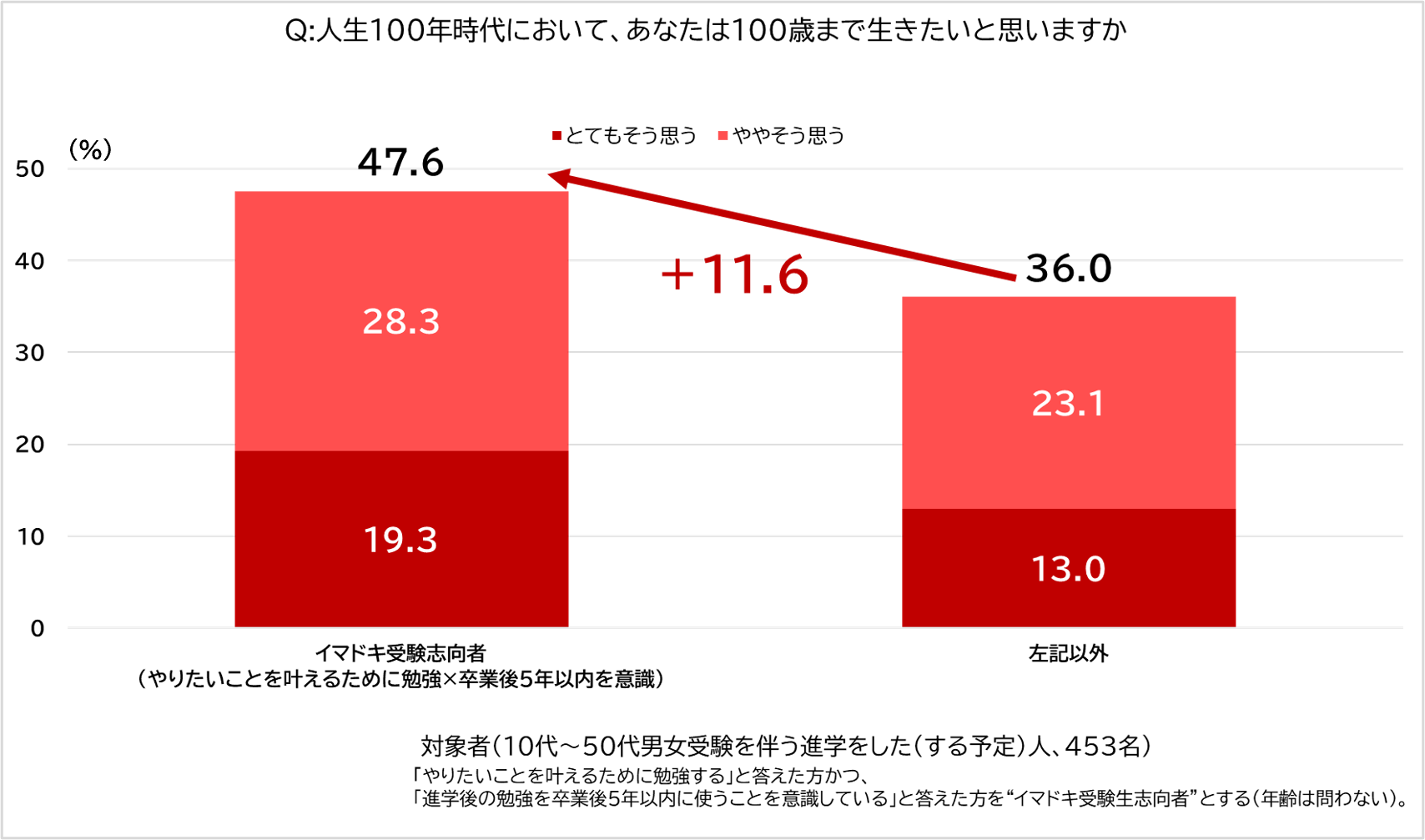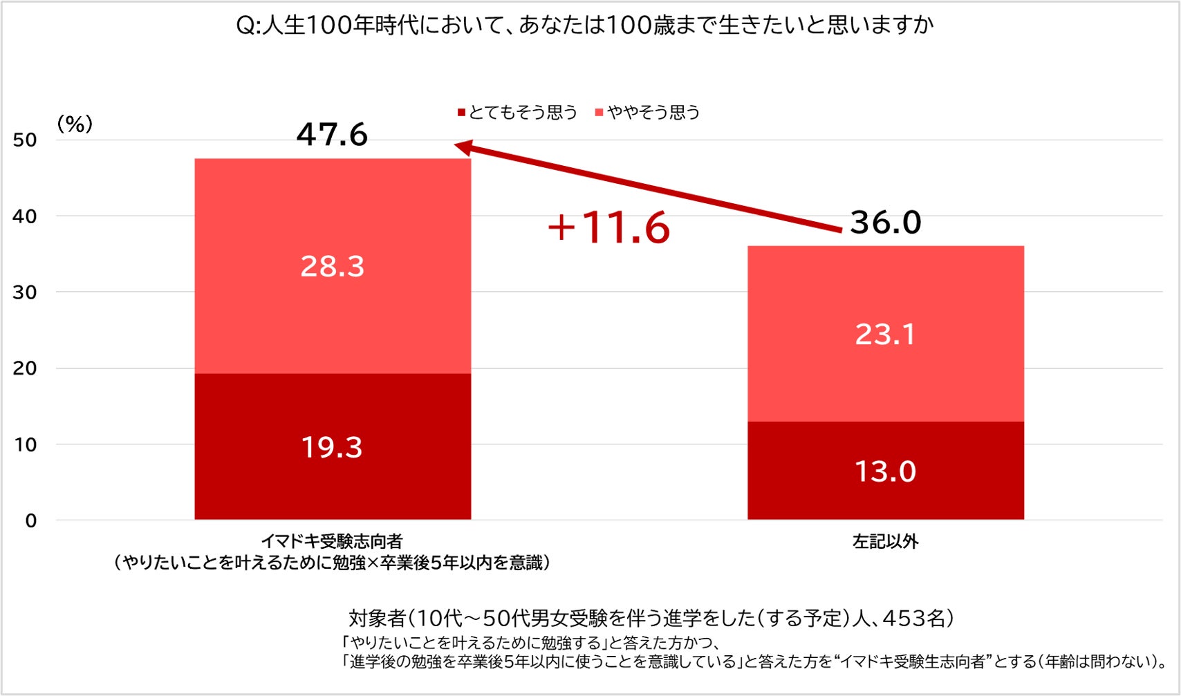 毎年1月に全国で大学入学共通テストが行われ、これを皮切りに受験シーズンが本格化します。そこで今回、100年生活者研究所は学びに対する向き合い方が人生100年時代における幸福度にどう影響するのか調査しました。その結果、受験を伴う進学をした(もしくはする予定の) 17歳から20代前半までを「イマドキ受験生」と定義すると、イマドキ受験生の半数以上は進学先での勉強内容を「5年以内」に使うと回答し、卒業後の短期的な目標を叶えるために進学していることが示唆されました。また、「100歳まで生きたい」という気持ちは、「短期的な目標を叶えるために進学する」というイマドキ受験生の特徴を持っている人の方が、そうでない人より11ポイント以上高い結果となりました。