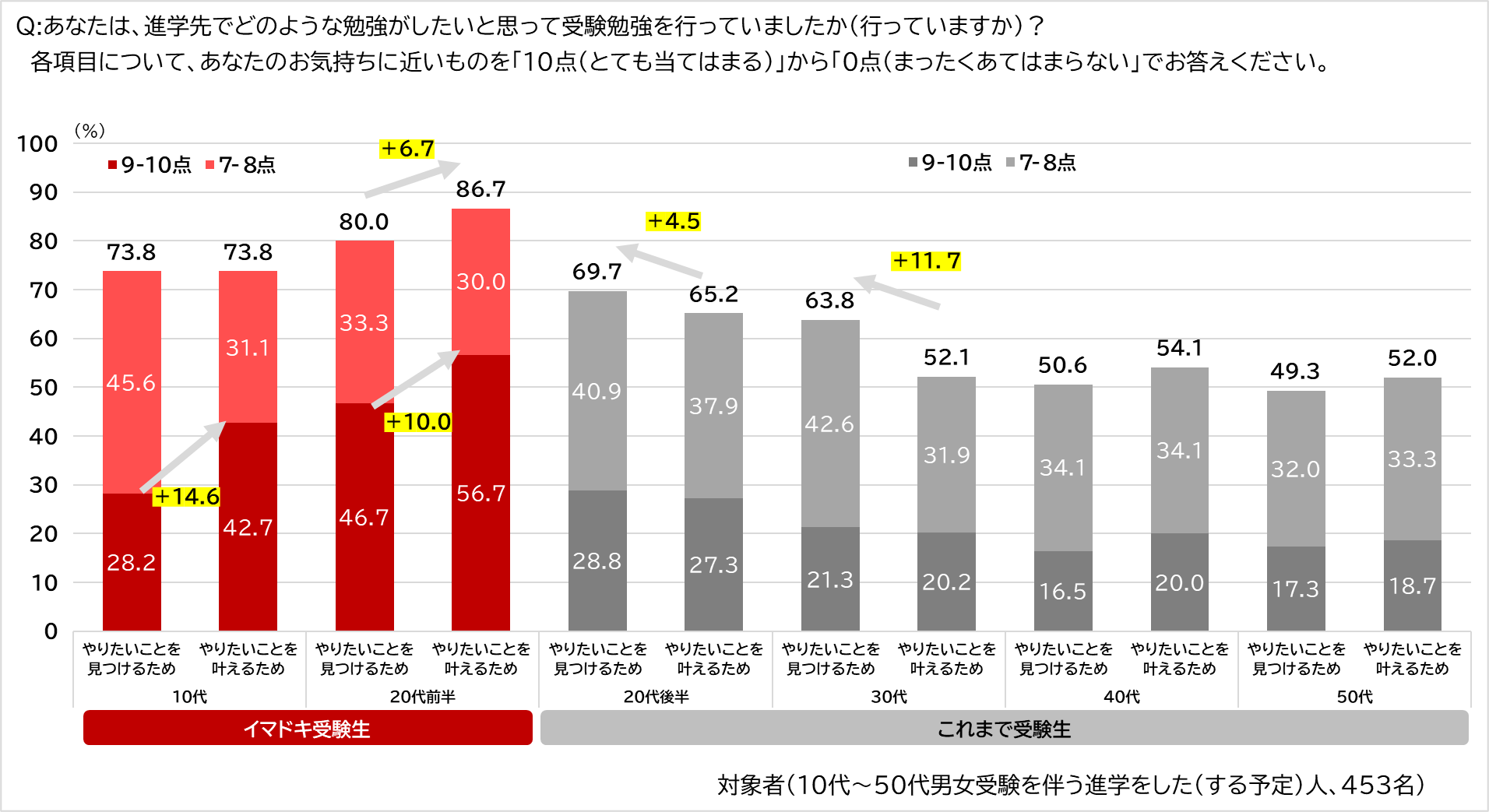 一方、20代後半以降は「やりたいことを叶えるため」という項目に9~10点と回答した割合は、「やりたいことを見つけるため」と同程度で、将来の目指すべき姿を探しながら勉強に向き合っている人がいることも特徴として挙がりました。
