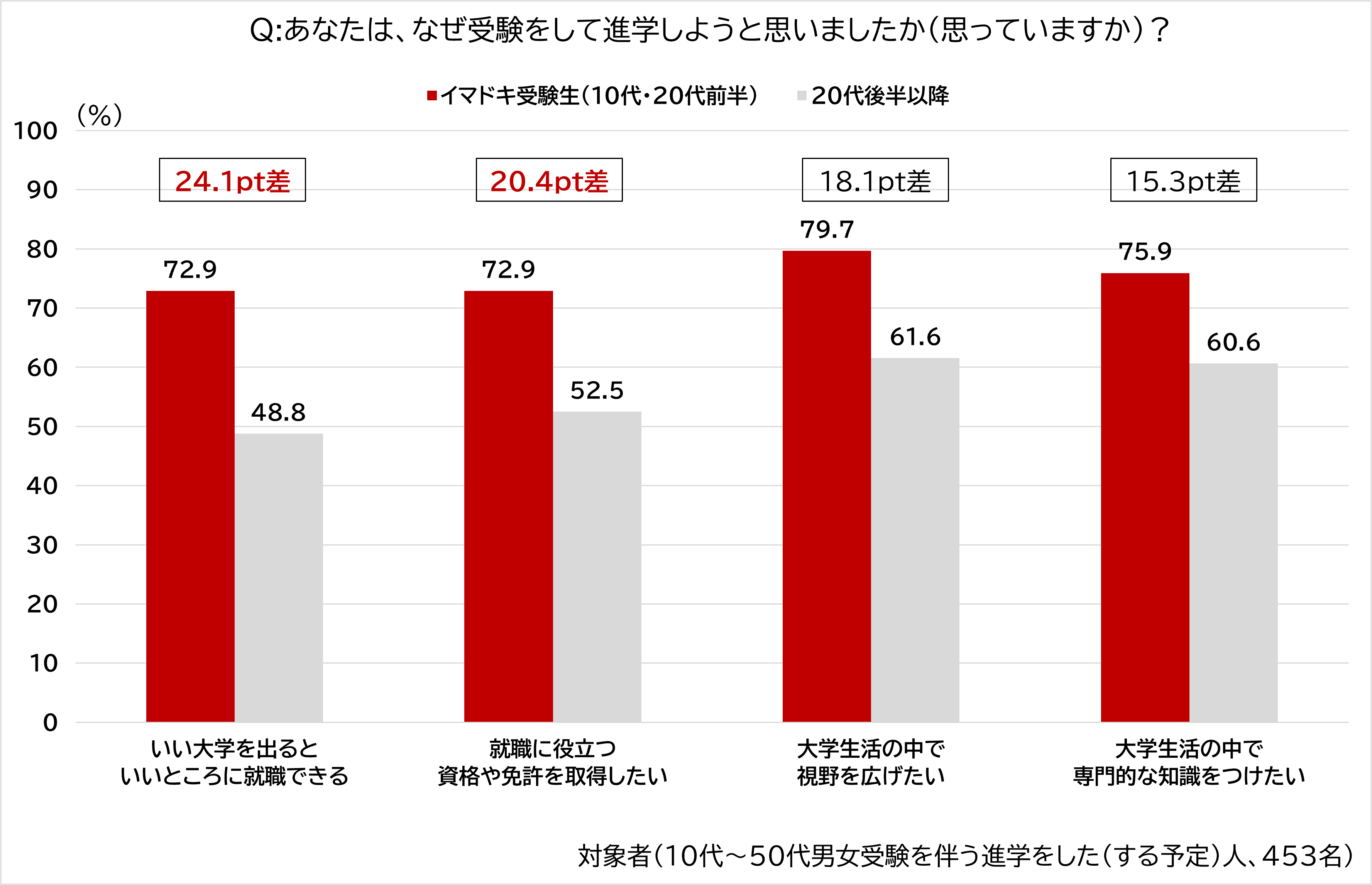 初めに受験した(またはこれからしようと思う)理由について調査しました。ここでは受験を伴う進学をした(もしくはする予定の) 17歳から20代前半までを「イマドキ受験生」と定義し、それ以外の世代(20代後半以降)と比較しています。その結果、イマドキ受験生の方が各回答項目の割合が高く、他の世代と比べて目的を持って進学している傾向が明らかになりました。特に、「いい大学を出るといいところに就職できる」は24.1ポイント差、「就職に役立つ資格や免許を取得したい」は20.4ポイント差と20ポイント以上高く、就職を強く意識して進学した(またはこれからしようと思っている)ことがわかりました。