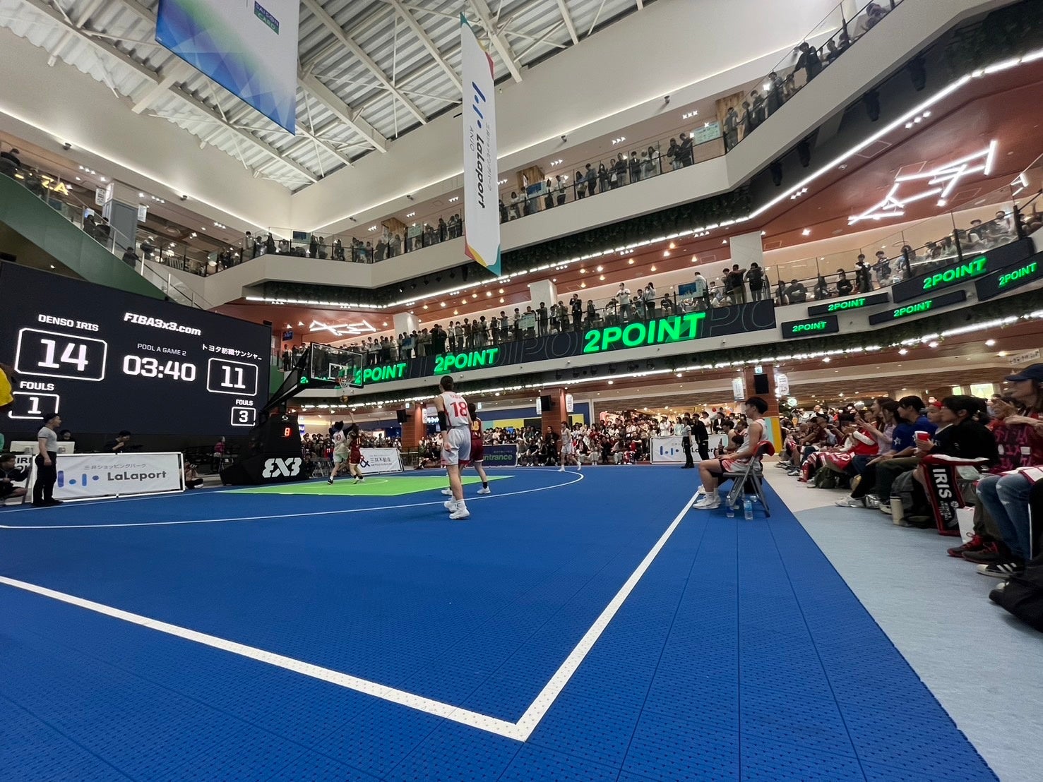 ハーフコートでコンパクトな場所に設置することができ、1ゲーム10分間という非常に短い時間の中でスピーディーにプレーが行われるのが3x3。今回、ららぽーと安城に設置されたSAISONスタジアムは観選手との距離も非常に近く、臨場感あふれる会場となりました。