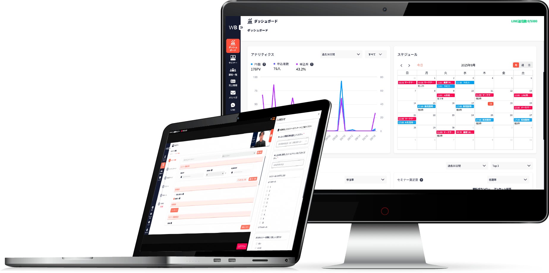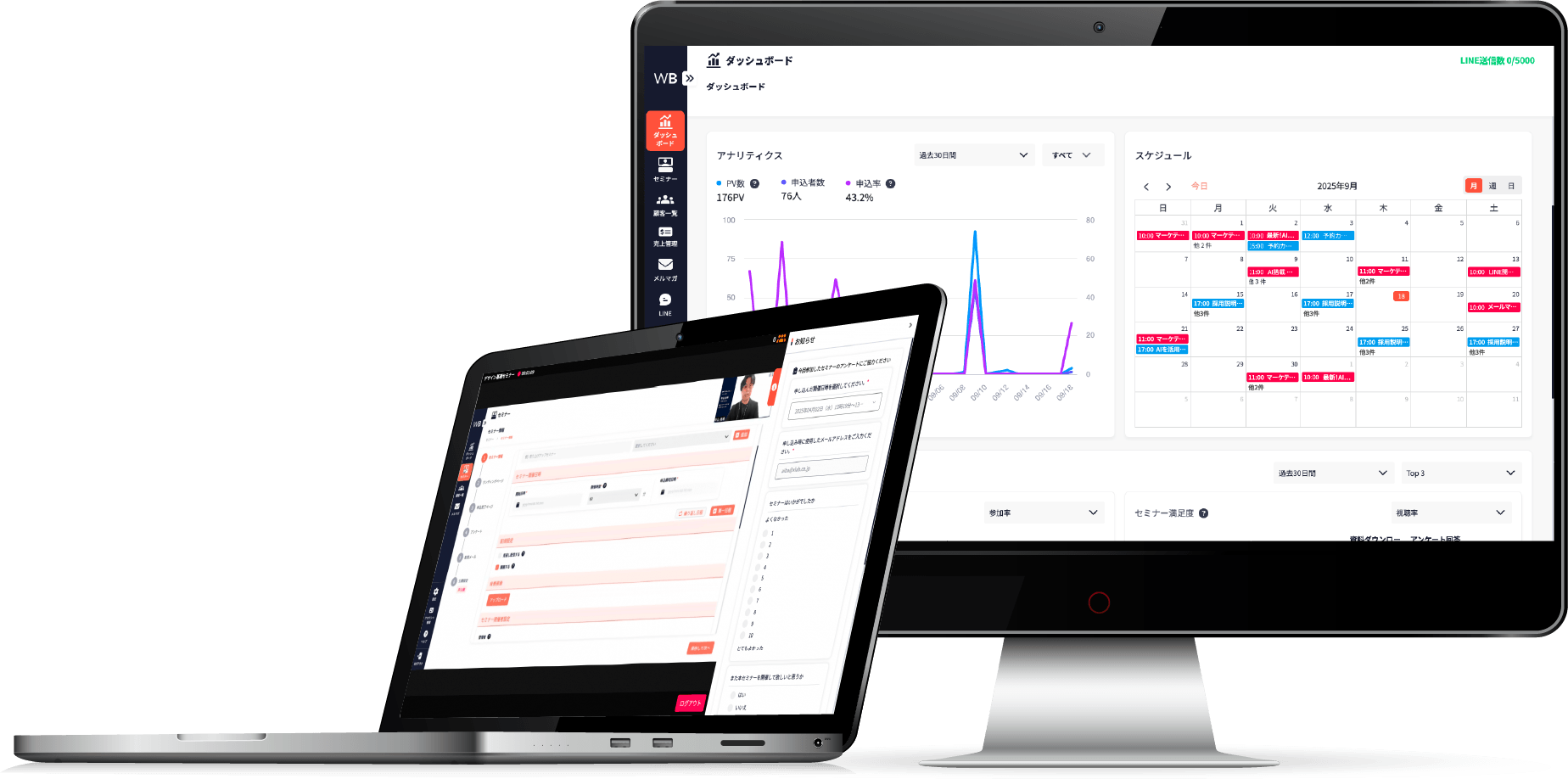 ユーザーの最終目的である「売上向上」をより直感的に把握できる設計へ刷新しました。売上をはじめとする主要KPIを画面上部に集約し、利用率の高い「セミナーランキング」も上位に表示。成果指標を明確化することで、データに基づく改善を後押しします。