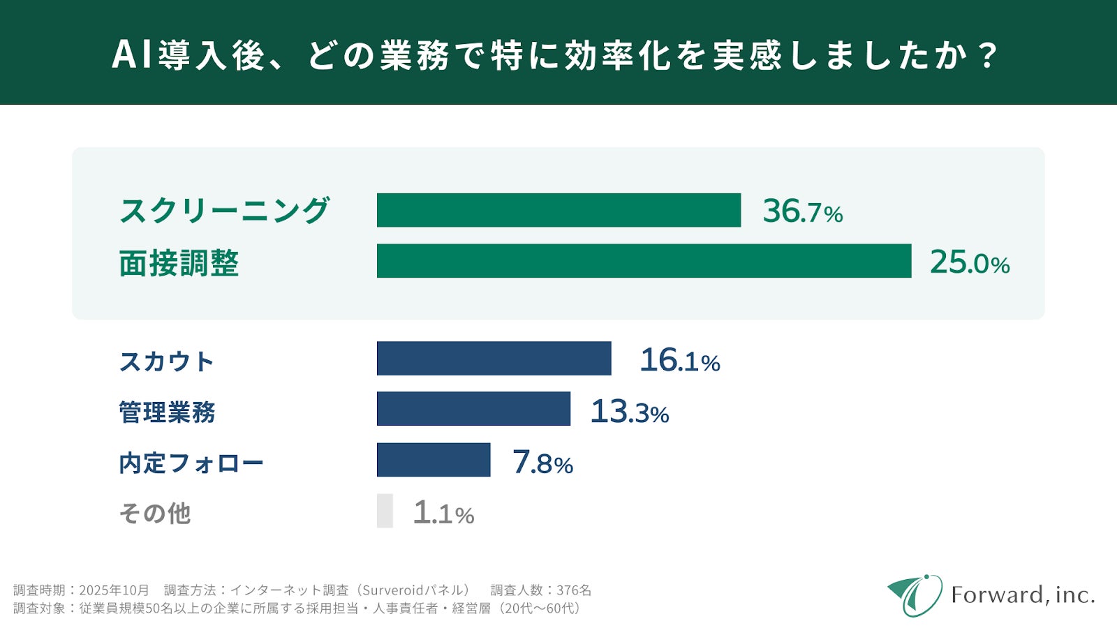 AIを用いた採用スカウト「エースジョブ」を運営する株式会社フォワード(本社:東京都新宿区、代表取締役:名古屋考平、以下「フォワード」)は、企業の採用業務におけるAI活用の実態を明らかにするため、「AI×採用実態調査」を実施しました。
