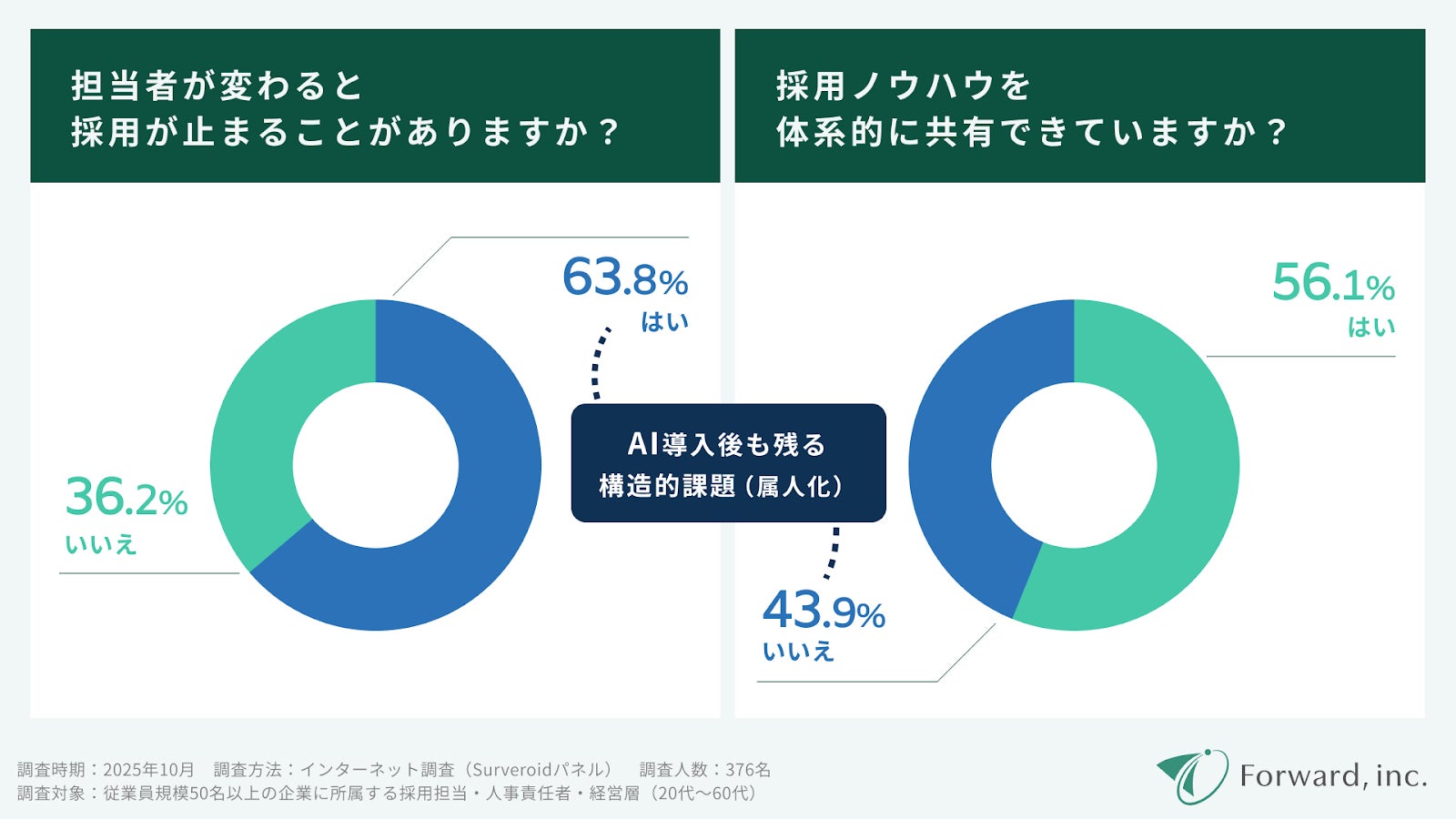 「担当者が変わると採用が止まる」企業は63.8%、「採用ノウハウを共有できている」企業は56.1%にとどまる。