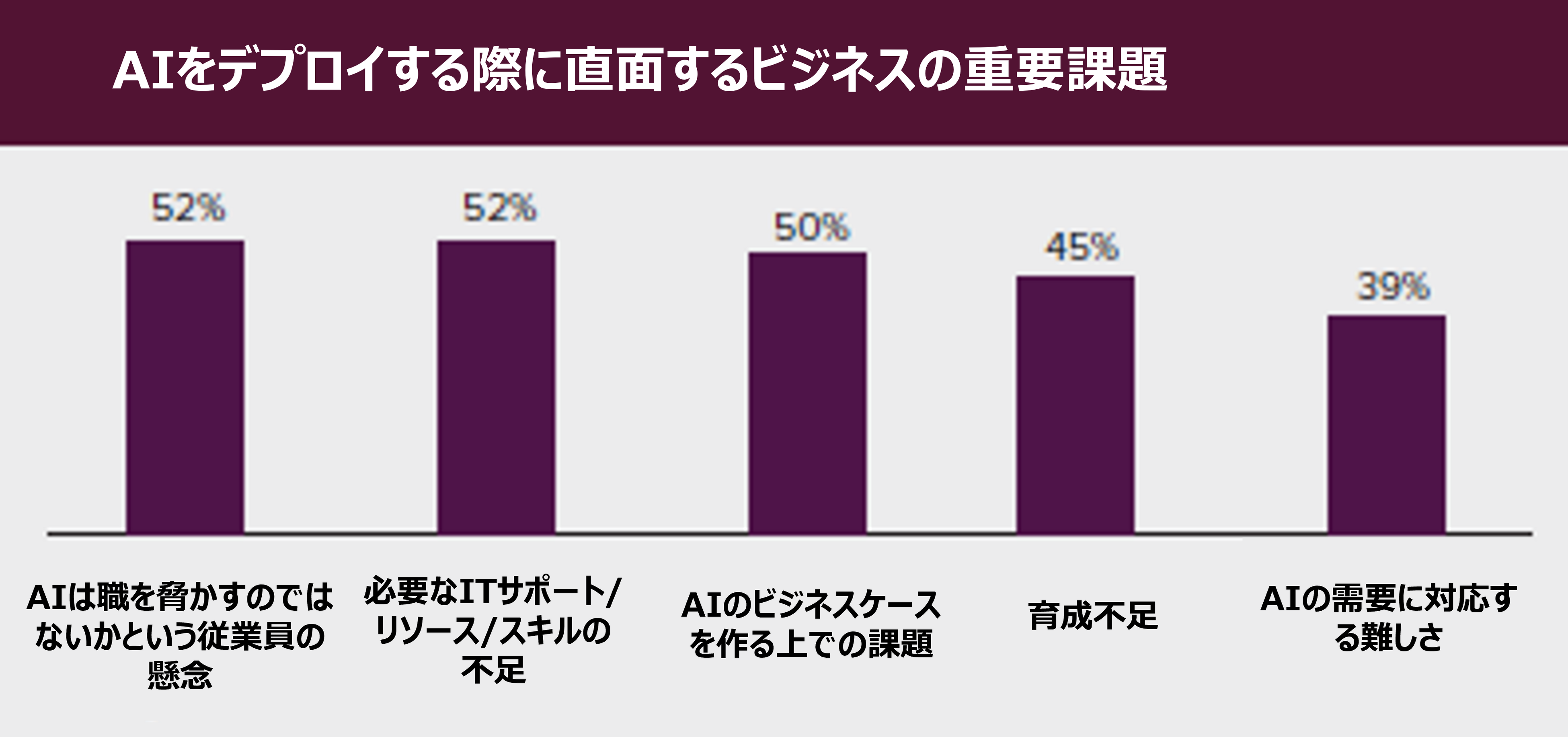 デプロイメントの課題:日本のCIOにとって重要な弱点は、AIテクノロジーのビジネスケースを明確化する能力(49%)と、AIツールのトレーニング不足(35%)